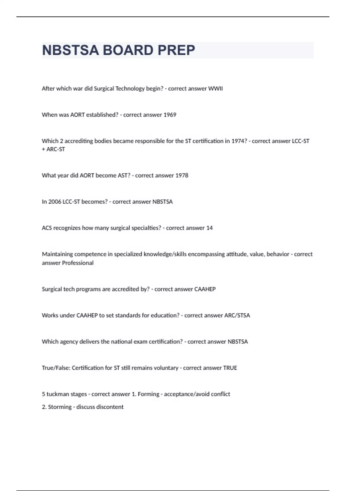 NBSTSA BOARD PREPAfter which war did Surgical Technology begin? WWII When was AORT established? 1969 Which 2 accrediting bodies became responsible for the ST certification in 1974? LCC-ST + ARC-ST What year did AORT become AST? 1978 In 2006 LCC-ST becomes? NBSTSA ACS recognizes how many surgical specialties? 14 Maintaining competence in specialized knowledge/skills encompassing attitude, value, behavior Professional Surgical tech programs are accredited by? CAAHEP Works under CAAHEP to set standards for education? ARC/STSA Which agency delivers the national exam certification? NBSTSA True/False: Certification for ST still remains voluntary TRUE 5 tuckman stages 1. Forming - acceptance/avoid conflict 2. Storming - discuss discontent 3. Norming - mutual plan 4. Performing - function 5. Adjourning - dissolves