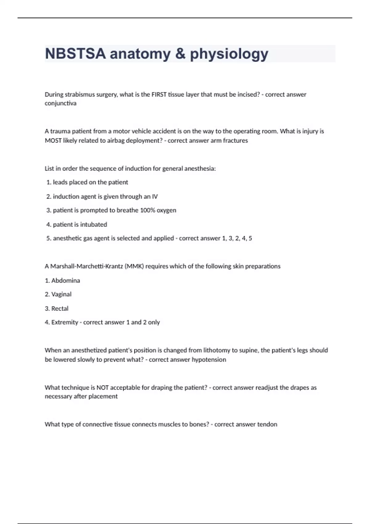 NBSTSA anatomy & physiologyDuring strabismus surgery, what is the FIRST tissue layer that must be incised? conjunctiva A trauma patient from a motor vehicle accident is on the way to the operating room. What is injury is MOST likely related to airbag deployment? arm fractures List in order the sequence of induction for general anesthesia: 1. leads placed on the patient 2. induction agent is given through an IV 3. patient is prompted to breathe 100% oxygen 4. patient is intubated 5. anesthetic gas agent is selected and applied 1, 3, 2, 4, 5 A Marshall-Marchetti-Krantz (MMK) requires which of the following skin preparations 1. Abdomina 2. Vaginal 3. Rectal 4. Extremity 1 and 2 only When an anesthetized patient's position is changed from lithotomy to supine, the patient's legs should be lowered slowly to prevent what? hypotension What technique is NOT acceptable for draping the patient? readjust the drapes as necessary after placement What type of connective tissue connects muscles to bones? tendon what is reshaped during a total hip arthroplasty? acetabulum What pathological condition may be caused by an excessive production of cerebrospinal fluid in the brain? hydrocephalus For a splenectomy procedure, what clamps could be used? Satinsky A patient entering the OR for a laparascopic cholecystectomy looks jaundiced. What is the best explanation for this? biliary obstruction