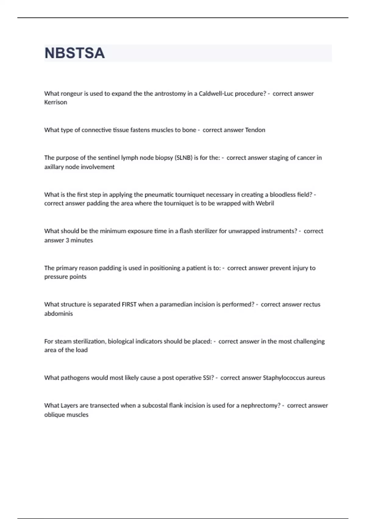 NBSTSAWhat rongeur is used to expand the the antrostomy in a Caldwell-Luc procedure? Kerrison What type of connective tissue fastens muscles to bone Tendon The purpose of the sentinel lymph node biopsy (SLNB) is for the: staging of cancer in axillary node involvement What is the first step in applying the pneumatic tourniquet necessary in creating a bloodless field? padding the area where the tourniquet is to be wrapped with Webril What should be the minimum exposure time in a flash sterilizer for unwrapped instruments? 3 minutes The primary reason padding is used in positioning a patient is to: prevent injury to pressure points What structure is separated FIRST when a paramedian incision is performed? rectus abdominis For steam sterilization, biological indicators should be placed: in the most challenging area of the load What pathogens would most likely cause a post operative SSI? Staphylococcus aureus What Layers are transected when a subcostal flank incision is used for a nephrectomy? oblique muscles Which of the following describes events that would require filing and incident report 1: medication error 2: Bullying 3: cardiac or respiratory arrest 4: Equipment failure prior to surgery 1,2, and 3 only During strabismus surgery. what is the first tissue layer that must be incised? conjunctiva A surgical technologist is explaining the steps of the ESU circuit to a student. The ST should explain that the electro current is channeled back to the generator through the: dispersive (inactive) electrode Hepatitis B is caused by a: virus An ST has selected the sutures for a procedure for a procedure based the surgeon's preference card. The surgeon states he would like additional sutures and his preference card is outdated. What is the surgical technologist's best course of action? Ask the surgeon if he would like to have his preference card updated and proceed accordingly