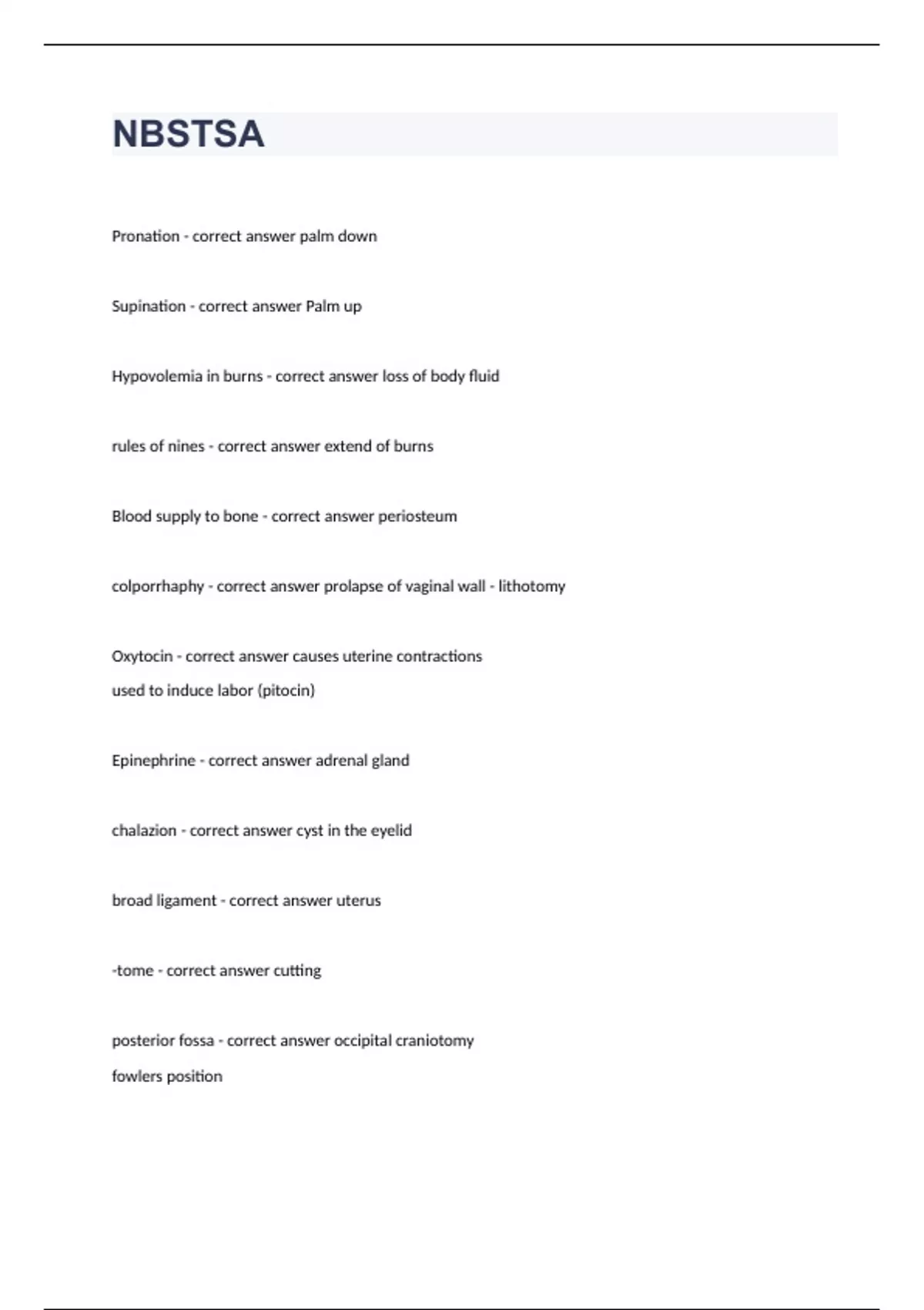 NBSTSAradiopaque A form of contrast media used within the body that is visible when exposed to x-ray is? a fluid filled sac A lumbar meningocele involves removal of? mastoidectomy Which of the following procedures may require a postauricular incision? damp dusting of surfaces each morning Bacteria can be reduced in the operating room by? protamine sulfate Which of the following drugs neutralizes the action of heparin? epinephrine (Adrenalin) The drug most commonly used to treat ventricular tachycardia is? 3,1,2 Place the following phases of wound healing by first intention in correct order from first to last 1 Proliferation 2 Remodeling 3 Inflammatory ligating clip appliers Which of the following may be needed during an emergency splenectomy that may not be required during a routine splenectomy? injecting a small amount of distilled water into the lumen Which of the following MUST be done before sterilizing an instrument with a lumen? 1 and 4 only Which of the following is MOST likely to be in place while transferring a patient from the operating room table to the stretcher 1 IV tubing 2 Fogarty catheter 3 EKG wires 4 Foley catheter