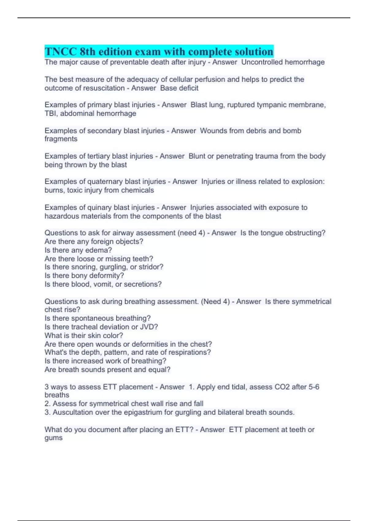 The major cause of preventable death after injury - Answer Uncontrolled hemorrhage The best measure of the adequacy of cellular perfusion and helps to predict the outcome of resuscitation - Answer Base deficit Examples of primary blast injuries - Answer Blast lung, ruptured tympanic membrane, TBI, abdominal hemorrhage Examples of secondary blast injuries - Answer Wounds from debris and bomb fragments Examples of tertiary blast injuries - Answer Blunt or penetrating trauma from the body being thrown by the blast Examples of quaternary blast injuries - Answer Injuries or illness related to explosion: burns, toxic injury from chemicals Examples of quinary blast injuries - Answer Injuries associated with exposure to hazardous materials from the components of the blast Questions to ask for airway assessment (need 4) - Answer Is the tongue obstructing? Are there any foreign objects? Is there any edema? Are there loose or missing teeth? Is there snoring, gurgling, or stridor? Is there bony deformity? Is there blood, vomit, or secretions? Questions to ask during breathing assessment. (Need 4) - Answer Is there symmetrical chest rise? Is there spontaneous breathing? Is there tracheal deviation or JVD? What is their skin color? Are there open wounds or deformities in the chest? What's the depth, pattern, and rate of respirations? Is there increased work of breathing? Are breath sounds present and equal? 3 ways to assess ETT placement - Answer 1. Apply end tidal, assess CO2 after 5-6 breaths 2. Assess for symmetrical chest wall rise and fall 3. Auscultation over the epigastrium for gurgling and bilateral breath sounds. What do you document after placing an ETT? - Answer ETT placement at teeth or gums