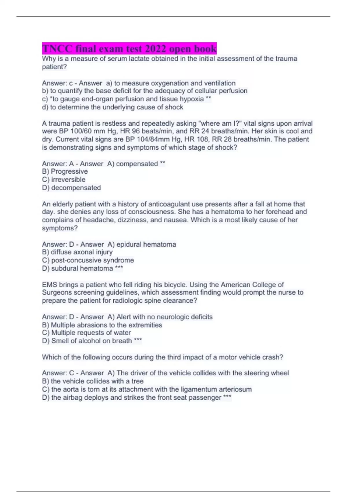 Why is a measure of serum lactate obtained in the initial assessment of the trauma patient? Answer: c - Answer a) to measure oxygenation and ventilation b) to quantify the base deficit for the adequacy of cellular perfusion c) *to gauge end-organ perfusion and tissue hypoxia ** d) to determine the underlying cause of shock A trauma patient is restless and repeatedly asking "where am I?" vital signs upon arrival were BP 100/60 mm Hg, HR 96 beats/min, and RR 24 breaths/min. Her skin is cool and dry. Current vital signs are BP 104/84mm Hg, HR 108, RR 28 breaths/min. The patient is demonstrating signs and symptoms of which stage of shock? Answer: A - Answer A) compensated ** B) Progressive C) irreversible D) decompensated An elderly patient with a history of anticoagulant use presents after a fall at home that day. she denies any loss of consciousness. She has a hematoma to her forehead and complains of headache, dizziness, and nausea. Which is a most likely cause of her symptoms? Answer: D - Answer A) epidural hematoma B) diffuse axonal injury C) post-concussive syndrome D) subdural hematoma *** EMS brings a patient who fell riding his bicycle. Using the American College of Surgeons screening guidelines, which assessment finding would prompt the nurse to prepare the patient for radiologic spine clearance? Answer: D - Answer A) Alert with no neurologic deficits B) Multiple abrasions to the extremities C) Multiple requests of water D) Smell of alcohol on breath *** Which of the following occurs during the third impact of a motor vehicle crash? Answer: C - Answer A) The driver of the vehicle collides with the steering wheel B) the vehicle collides with a tree C) the aorta is torn at its attachment with the ligamentum arteriosum D) the airbag deploys and strikes the front seat passenger *** A passenger is bro