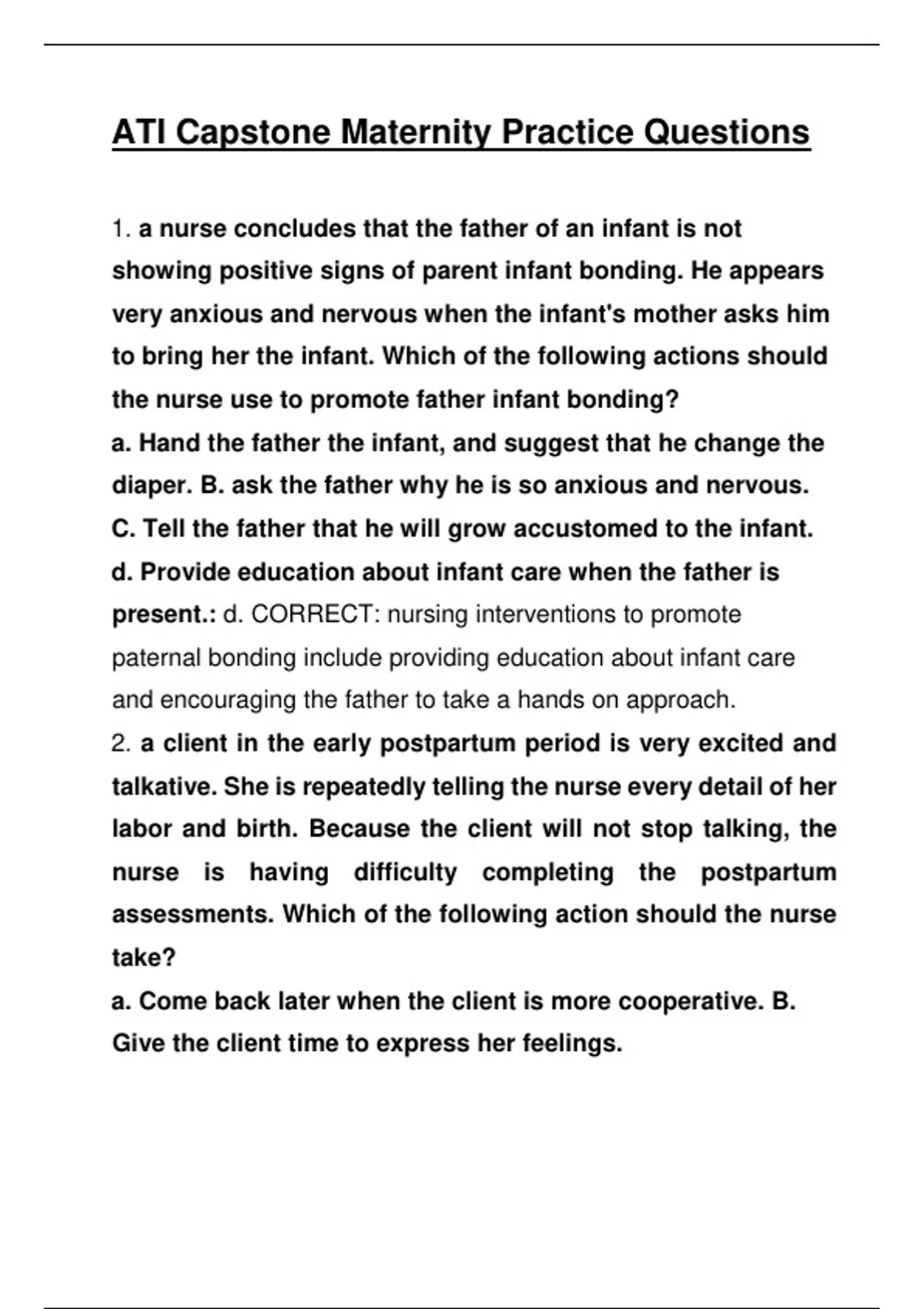 ATI Capstone Maternity Practice Questions C. Tell the client she needs to be quiet so the assessment can be completed. d. redirect the client's focus so that she will become quiet.: B. CORRECT: The nurse should recognize that the client in is the taking in phase, which begins immediately following birth and lasts a few hours to a couple of days. 3. a nurse is caring for a client who is 1 day postpartum. The nurse is assessing for maternal adaptation and mother infant bonding. Which of the following behaviors by the client indicates a need for the nurse to intervene? (Select all that apply.) a. demonstrates apathy when the infant cries B. Touches the infant and maintains close physical proximity C. Views the infant's behavior as uncooperative during diaper changing d. identifies and relates infant's characteristics to those of family members e. interprets the infant's behavior as meaningful and a way of expressing needs: C. CORRECT: a client's view of her infant as being uncooperative during diaper changing is a sign of impaired maternal infant bonding. 4. a nurse is caring for a client who is 2 days postpartum. The client states, "My 4 year old son was toilet trained and