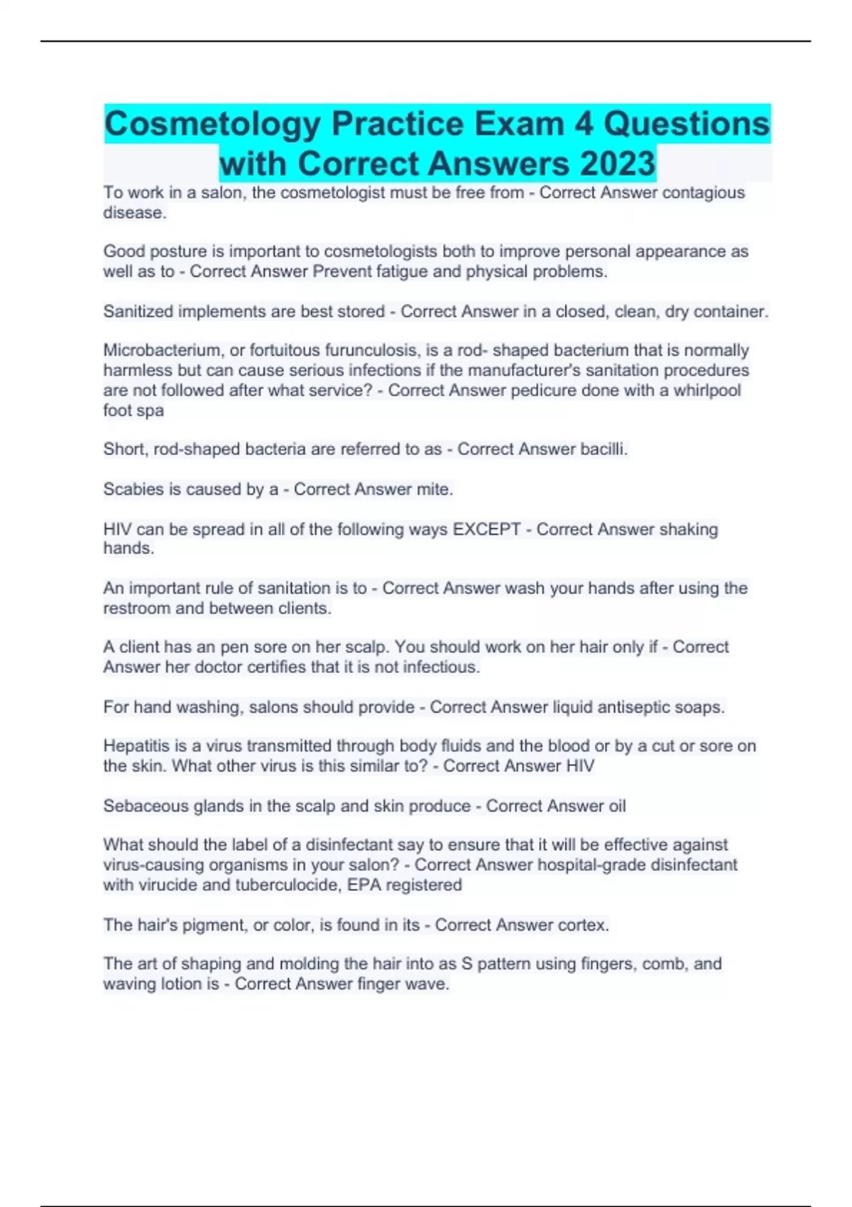 Cosmetology Practice Exam 4 Questions with Correct Answers 2023