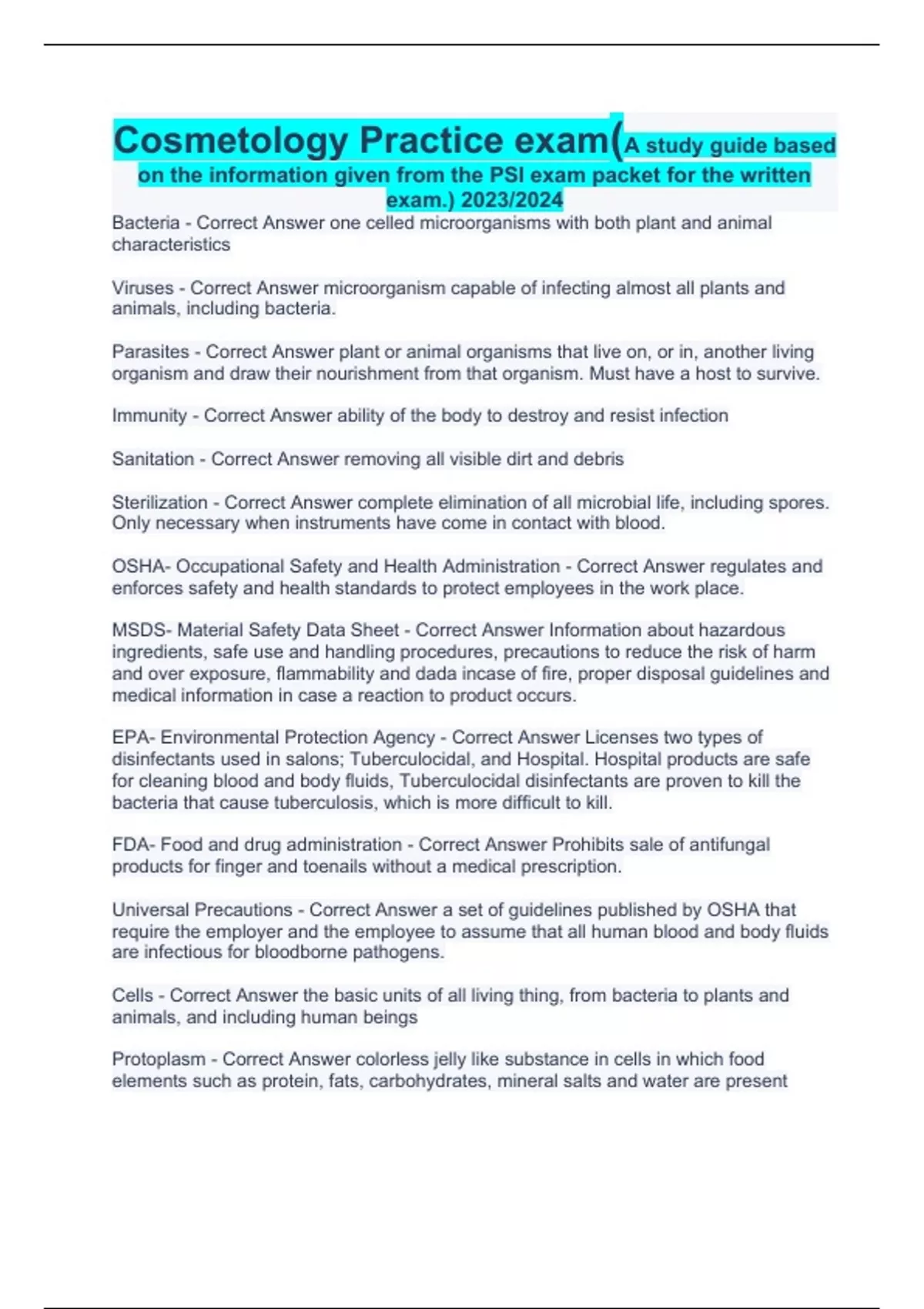 Cosmetology Practice exam(A study guide based on the information given from the PSI exam packet for the written exam.) 2023/2024