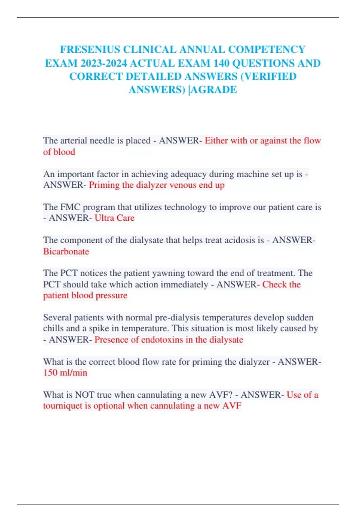 FRESENIUS CLINICAL ANNUAL COMPETENCY EXAM ACTUAL EXAM 140 QUESTIONS AND CORRECT DETAILED ANSWERS (VERIFIED ANSWERS) |AGRADE