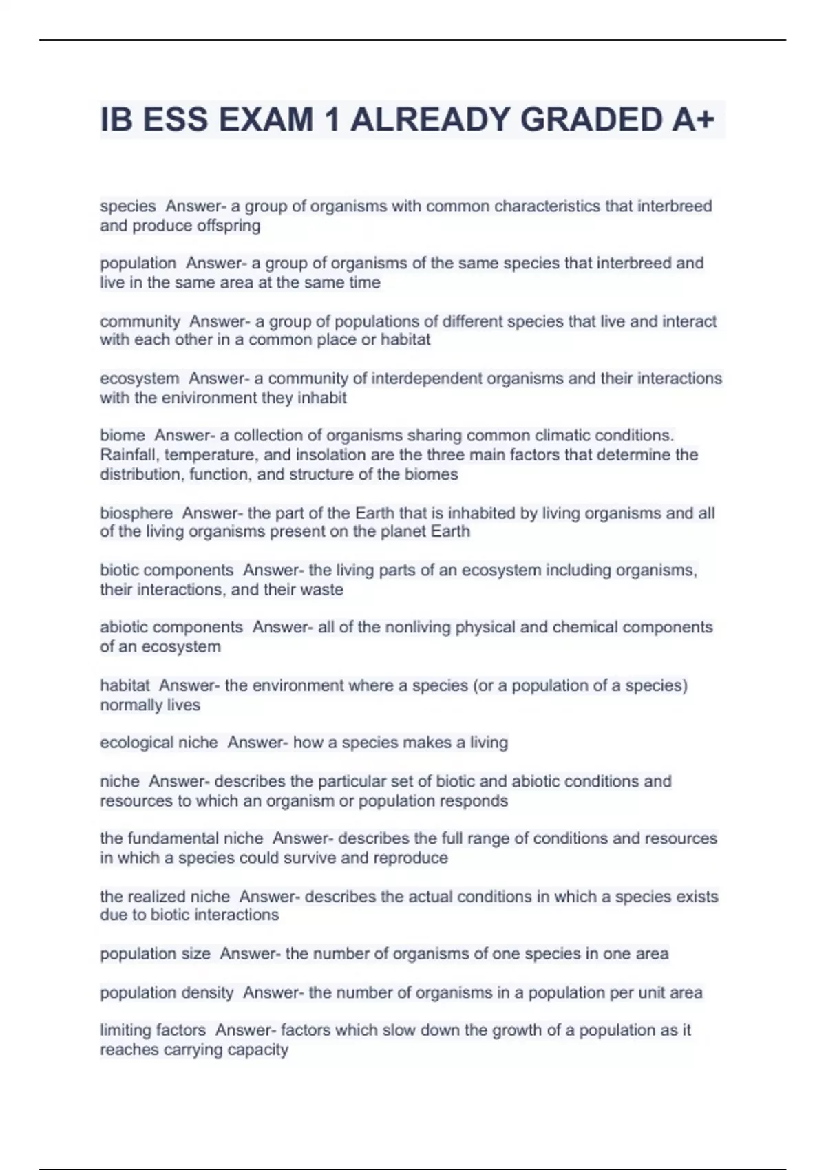 IB ESS EXAM 1 ALREADY GRADED A+