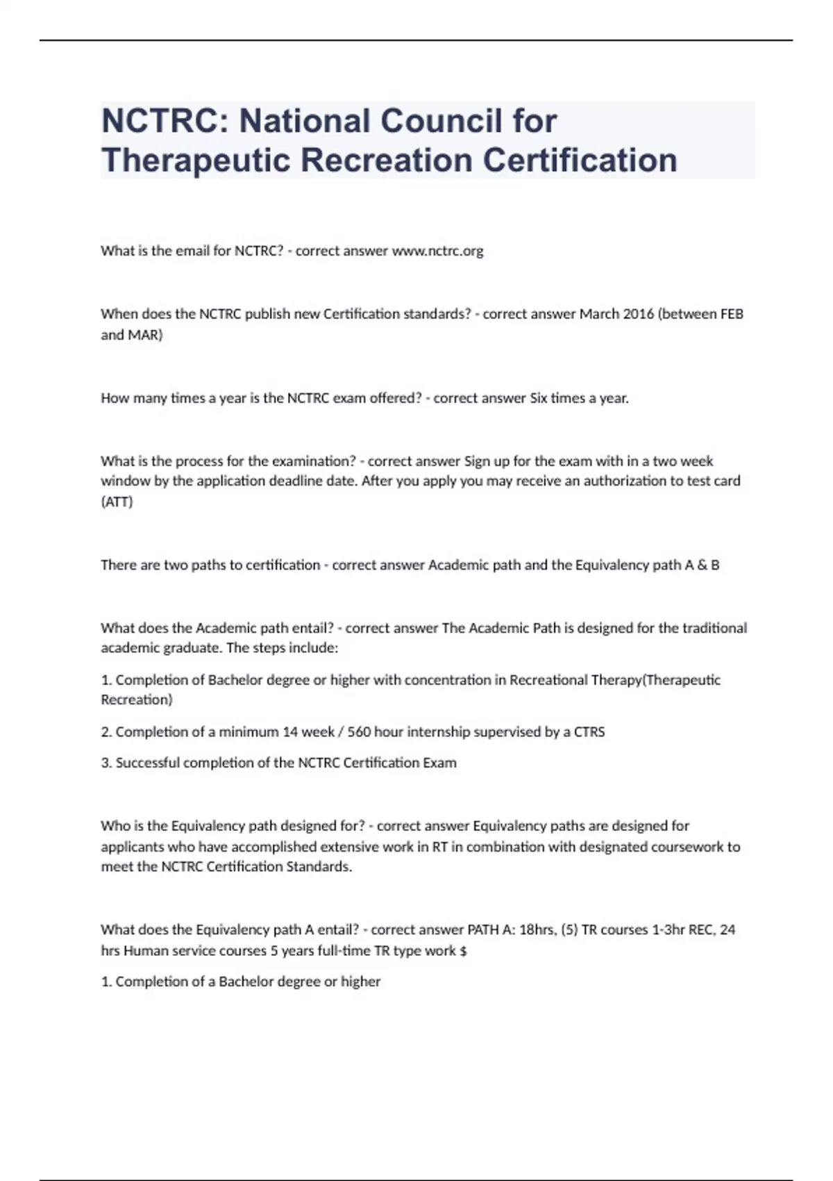 NCTRC: National Council for Therapeutic Recreation CertificationWhat is the email for NCTRC? When does the NCTRC publish new Certification standards? March 2016 (between FEB and MAR) How many times a year is the NCTRC exam offered? Six times a year. What is the process for the examination? Sign up for the exam with in a two week window by the application deadline date. After you apply you may receive an authorization to test card (ATT) There are two paths to certification Academic path and the Equivalency path A & B What does the Academic path entail? The Academic Path is designed for the traditional academic graduate. The steps include: 1. Completion of Bachelor degree or higher with concentration in Recreational Therapy(Therapeutic Recreation) 2. Completion of a minimum 14 week / 560 hour internship supervised by a CTRS 3. Successful completion of the NCTRC Certification Exam Who is the Equivalency path designed for? Equivalency paths are designed for applicants who have accomplished extensive work in RT in combination with designated coursework to meet the NCTRC Certification Standards. What does the Equivalency path A entail? PATH A: 18hrs, (5) TR courses 1-3hr REC, 24 hrs Human service courses 5 years full-time TR type work $ 1. Completion of a Bachelor degree or higher 2. Completion of specific coursework in Recreational Therapy (TherapeuticRecreation) and related areas 3. Five (5) years full-time paid work experience in Recreational Therapy (Therapeutic Recreation) 4. Successful completion of the NCTRC Certification Exam What does the Equivalency path B entail? PATH B: (5) TR courses 1-3hr REC, A&P, Lifespan development, Abnormal Psych; 9hrs electives: human service area (psych, SPED, MED terminology); 1yr internship. 1. Completion of a Bachelor degree or higher 2. Completion of specific coursework in Recreational Therapy (Therapeutic Recreation) and related areas 3. One (1) year full-time paid work experience in Recreational Therapy (Therapeutic Recreation) under the supervision of a CTRS 4. Successful completion of the NCTRC Certification Exam
