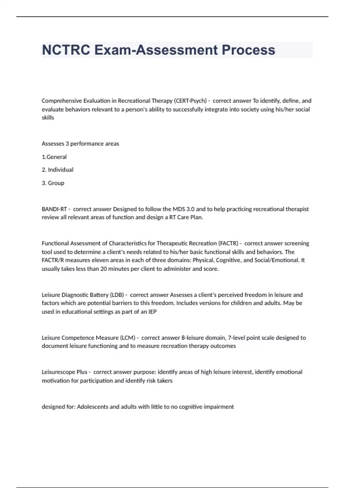 NCTRC Exam-Assessment ProcessComprehensive Evaluation in Recreational Therapy (CERT-Psych) To identify, define, and evaluate behaviors relevant to a person's ability to successfully integrate into society using his/her social skills Assesses 3 performance areas 1.General 2. Individual 3. Group BANDI-RT Designed to follow the MDS 3.0 and to help practicing recreational therapist review all relevant areas of function and design a RT Care Plan. Functional Assessment of Characteristics for Therapeutic Recreation (FACTR) screening tool used to determine a client's needs related to his/her basic functional skills and behaviors. The FACTR/R measures eleven areas in each of three domains: Physical, Cognitive, and Social/Emotional. It usually takes less than 20 minutes per client to administer and score. Leisure Diagnostic Battery (LDB) Assesses a client's perceived freedom in leisure and factors which are potential barriers to this freedom. Includes versions for children and adults. May be used in educational settings as part of an IEP Leisure Competence Measure (LCM) 8-leisure domain, 7-level point scale designed to document leisure functioning and to measure recreation therapy outcomes Leisurescope Plus purpose: identify areas of high leisure interest, identify emotional motivation for participation and identify risk takers designed for: Adolescents and adults with little to no cognitive impairment it measures: the degree of interest in 10 areas of leisure, Feelings concerning involvement, Degree to which the client seeks risk taking activities