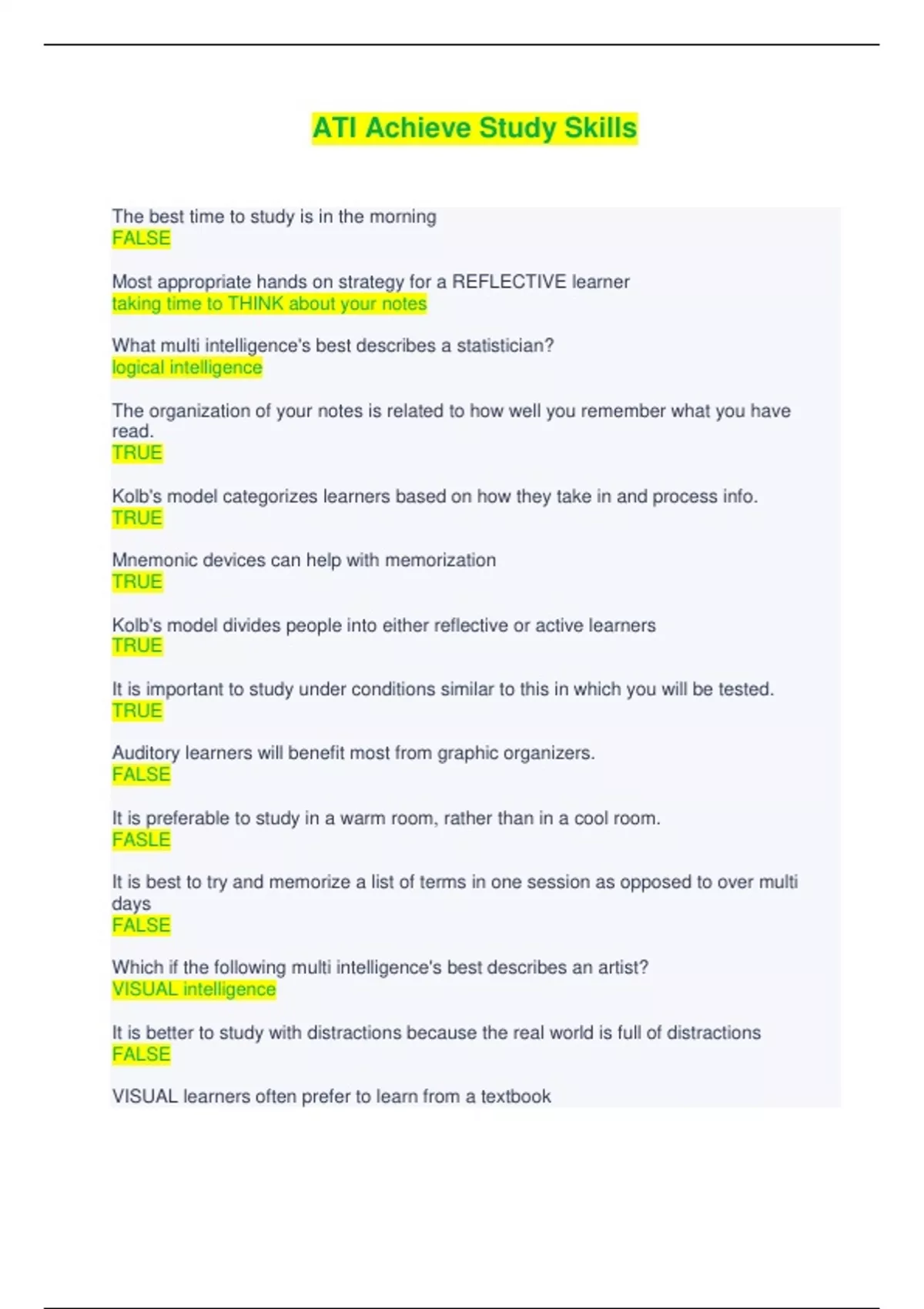 ATI Achieve Study Skills - Q & A The best time to study is in the morning FALSE Most appropriate hands on strategy for a REFLECTIVE learner taking time to THINK about your notes What multi intelligence's best describes a statistician? logical intelligence The organization of your notes is related to how well you remember what you have read. TRUE Kolb's model categorizes learners based on how they take in and process info. TRUE Mnemonic devices can help with memorization TRUE Kolb's model divides people into either reflective or active learners