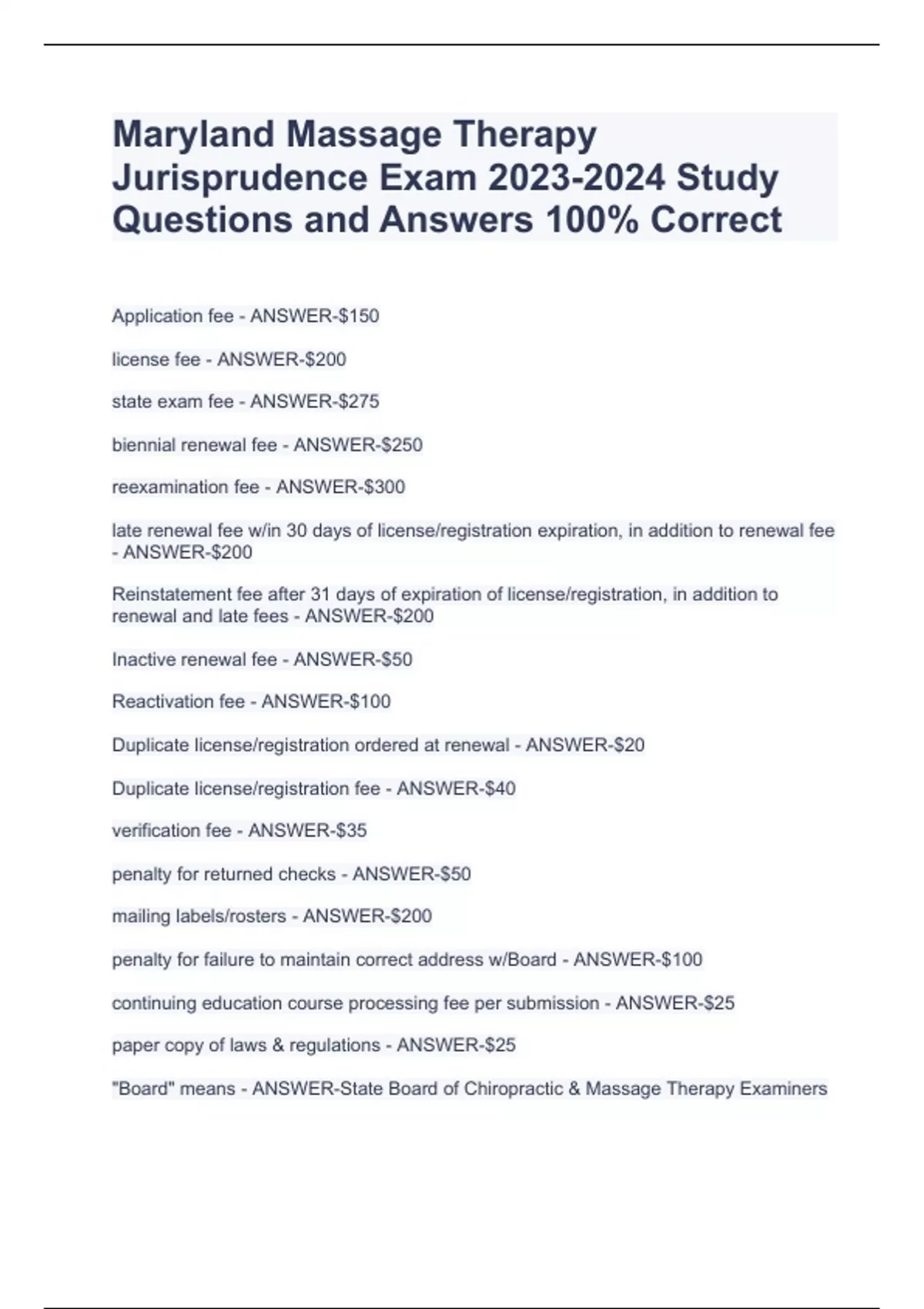 Maryland Massage Therapy Jurisprudence Exam Study Questions and Answers 100% Correct Maryland Massage Therapy Jurisprudence Exam Study Questions and Answers 100% Correct Maryland Massage Therapy Jurisprudence Exam Study Questions and Answers 100% Correct Application fee - ANSWER-$150 license fee - ANSWER-$200 state exam fee - ANSWER-$275 biennial renewal fee - ANSWER-$250 reexamination fee - ANSWER-$300 late renewal fee w/in 30 days of license/registration expiration, in addition to renewal fee - ANSWER-$200 Reinstatement fee after 31 days of expiration of license/registration, in addition to renewal and late fees - ANSWER-$200 Inactive renewal fee - ANSWER-$50 Reactivation fee - ANSWER-$100 Duplicate license/registration ordered at renewal - ANSWER-$20