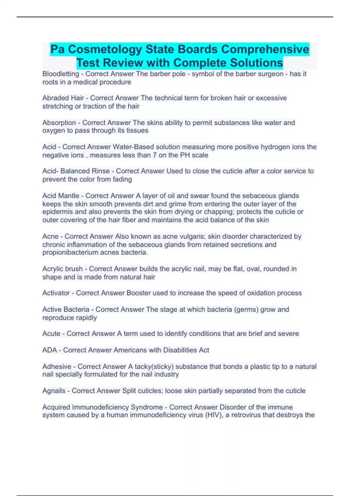 Bloodletting - Correct Answer The barber pole - symbol of the barber surgeon - has it roots in a medical procedure Abraded Hair - Correct Answer The technical term for broken hair or excessive stretching or traction of the hair Absorption - Correct Answer The skins ability to permit substances like water and oxygen to pass through its tissues Acid - Correct Answer Water-Based solution measuring more positive hydrogen ions the negative ions , measures less than 7 on the PH scale Acid- Balanced Rinse - Correct Answer Used to close the cuticle after a color service to prevent the color from fading Acid Mantle - Correct Answer A layer of oil and swear found the sebaceous glands keeps the skin smooth prevents dirt and grime from entering the outer layer of the epidermis and also prevents the skin from drying or chapping; protects the cuticle or outer covering of the hair fiber and maintains the acid balance of the skin Acne - Correct Answer Also known as acne vulgaris; skin disorder characterized by chronic inflammation of the sebaceous glands from retained secretions and propionibacterium acnes bacteria. Acrylic brush - Correct Answer builds the acrylic nail, may be flat, oval, rounded in shape and is made from natural hair Activator - Correct Answer Booster used to increase the speed of oxidation process Active Bacteria - Correct Answer The stage at which bacteria (germs) grow and reproduce rapidly Acute - Correct Answer A term used to identify conditions that are brief and severe ADA - Correct Answer Americans with Disabilities Act Adhesive - Correct Answer A tacky(sticky) substance that bonds a plastic tip to a natural nail specially formulated for the nail industry Agnails - Correct Answer Split cuticles; loose skin partially separated from the cuticle Acquired Immunodeficiency Syndrome - Correct Answer Disorder of the immune system caused by a human immunodeficiency virus (HIV), a retrovirus that destroys the body's ability to fight infection