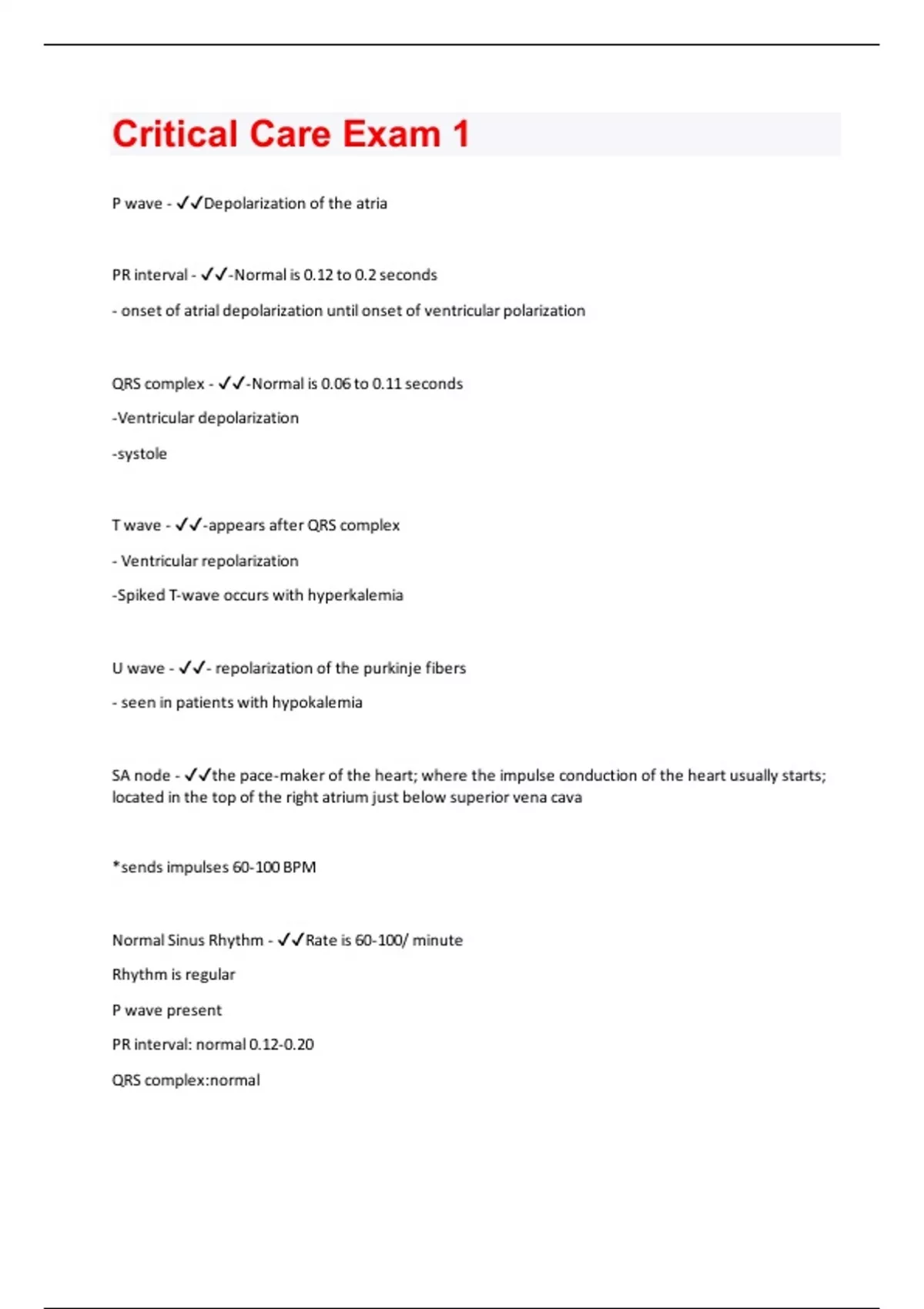 P wave - Depolarization of the atria PR interval - -Normal is 0.12 to 0.2 seconds - onset of atrial depolarization until onset of ventricular polarization QRS complex - -Normal is 0.06 to 0.11 seconds -Ventricular depolarization -systole T wave - -appears after QRS complex - Ventricular repolarization -Spiked T-wave occurs with hyperkalemia U wave - - repolarization of the purkinje fibers - seen in patients with hypokalemia SA node - the pace-maker of the heart; where the impulse conduction of the heart usually starts; located in the top of the right atrium just below superior vena cava *sends impulses 60-100 BPM Normal Sinus Rhythm - Rate is 60-100/ minute Rhythm is regular P wave present PR interval: normal 0.12-0.20 QRS complex:normalInterpretation: normal sinus rhythm normal QRS: 0.06- 0.10 Sinus Bradycardia - Rate is <60/minute Rhythm is regular P wave present PR interval: normal 0.12-0.20 QRS complex:normal Interpretation: treat sinus brady with *0.5mg atropine ( if emergent)* , dopamine, epinephrine, pacer. *normal in patients when sleeping or sleeping -may occur with use of Beta blockers or calcium channel blockers, digoxin, morphine, vagal stimulation, hypothermia, hypothroidism Sinus Tachycardia - Rate is >100/min (usually below 160) Rhythm is regular P wave present PR interval: normal 0.12-0.20 QRS complex:normal 0.6-0.10 Interpretation: correct the underlying cause, adminster beta blockers or calcium channel blockers. *treat underlying cause.** - may be a normal response from a fever, exercise, anxiety, pain, dehydration. May accompany shock, LHF, hyperthyroidism, anemia, hypovolemia, PE, MI -can be caused by caffiene, nicotine, amphetemines, atropine, cocaine.Sinus Arrhythmia - Rate: increases on inspiration, decreases on expiration Rhythm: *Always has irregular rhythm* P waves?: yes PR interval: normal QRS: normal Significance: usually a normal finding and usually is *not treated