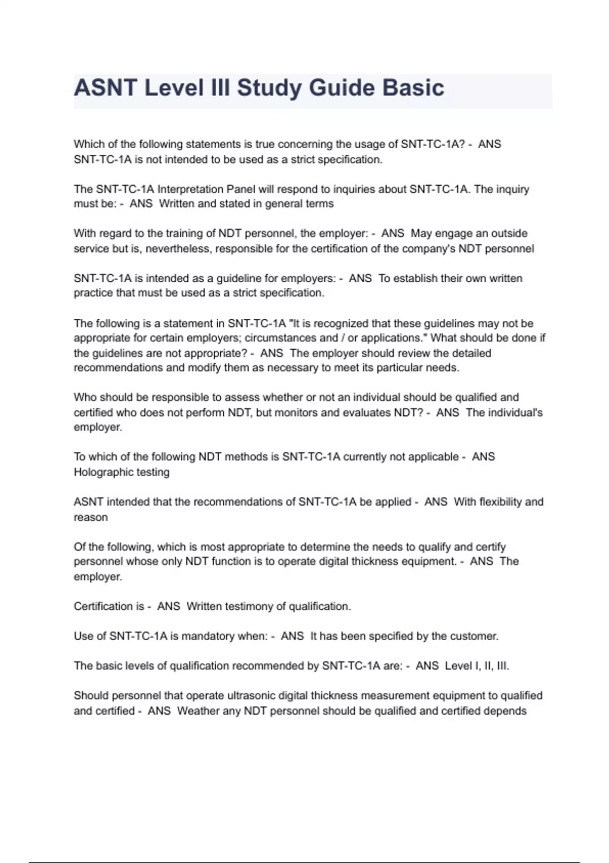 ASNT Level III Study Guide Basic All Questions Answered Which of the following statements is true concerning the usage of SNT-TC-1A? - ANS SNT-TC-1A is not intended to be used as a strict specification. The SNT-TC-1A Interpretation Panel will respond to inquiries about SNT-TC-1A. The inquiry must be: - ANS Written and stated in general terms With regard to the training of NDT personnel, the employer: - ANS May engage an outside service but is, nevertheless, responsible for the certification of the company's NDT personnel SNT-TC-1A is intended as a guideline for employers: - ANS To establish their own written practice that must be used as a strict specification. The following is a statement in SNT-TC-1A "It is recognized that these guidelines may not be appropriate for certain employers; circumstances and / or applications." What should be done if the guidelines are not appropriate? - ANS The employer should review the detailed recommendations and modify them as necessary to meet its particular needs. Who should be responsible to assess whether or not an individual should be qualified and certified who does not perform NDT, but monitors and evaluates NDT? - ANS The individual's employer. To which of the following NDT methods is SNT-TC-1A currently not applicable - ANS Holographic testing ASNT intended that the recommendations of SNT-TC-1A be applied - ANS With flexibility and reason Of the following, which is most appropriate to determine the needs to qualify and certify personnel whose only NDT function is to operate digital thickness equipment. - ANS The employer. Certification is - ANS Written testimony of qualification. Use of SNT-TC-1A is mandatory when: - ANS It has been specified by the customer. The basic levels of qualification recommended by SNT-TC-1A are: - ANS Level I, II, III. Should personnel that operate ultrasonic digital thickness measurement equipment to qualified and certified - ANS Weather any NDT personnel should be qualified and certified depends solely upon the needs of the employer and the requirements of the employer's customers or clientele. According to the recommendations of SNT-TC-1A which of the following is true concerning a Trainee's activities? - ANS The Trainee may not conduct nondestructive test independently and may not report test results According to SNT-TC-1A, which of the following is not true for a Level III? - ANS Must train and examine the Level I and II personnel in his or her organization. According to written instructions, an NDT Level
