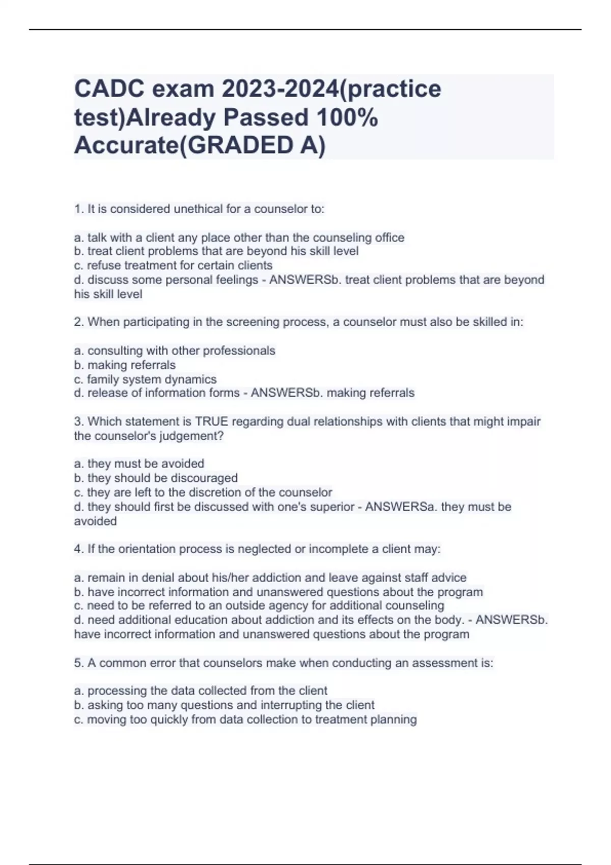 CADC exam (practice test)Already Passed 100% Accurate(GRADED A)CADC exam (practice test)Already Passed 100% Accurate(GRADED A)CADC exam (practice test)Already Passed 100% Accurate(GRADED A)CADC exam (practice test)Already Passed 100% Accurate(GRADED A) 1. It is considered unethical for a counselor to: a. talk with a client any place other than the counseling office b. treat client problems that are beyond his skill level c. refuse treatment for certain clients d. discuss some personal feelings - ANSWERSb. treat client problems that are beyond his skill level 2. When participating in the screening process, a counselor must also be skilled in: a. consulting with other professionals b. making referrals c. family system dynamics d. release of information forms - ANSWERSb. making referrals 3. Which statement is TRUE regarding dual relationships with clients that might impair the counselor's judgement? a. they must be avoided b. they should be discouraged c. they are left to the discretion of the counselor d. they should first be discussed with one's superior - ANSWERSa. they must be avoided 4. If the orientation process is neglected or incomplete a client may: a. remain in denial about his/her addiction and leave against staff advice b. have incorrect information and unanswered questions about the program c. need to be referred to an outside agency for additional counseling d. need additional education about addiction and its effects on the body. - ANSWERSb. have