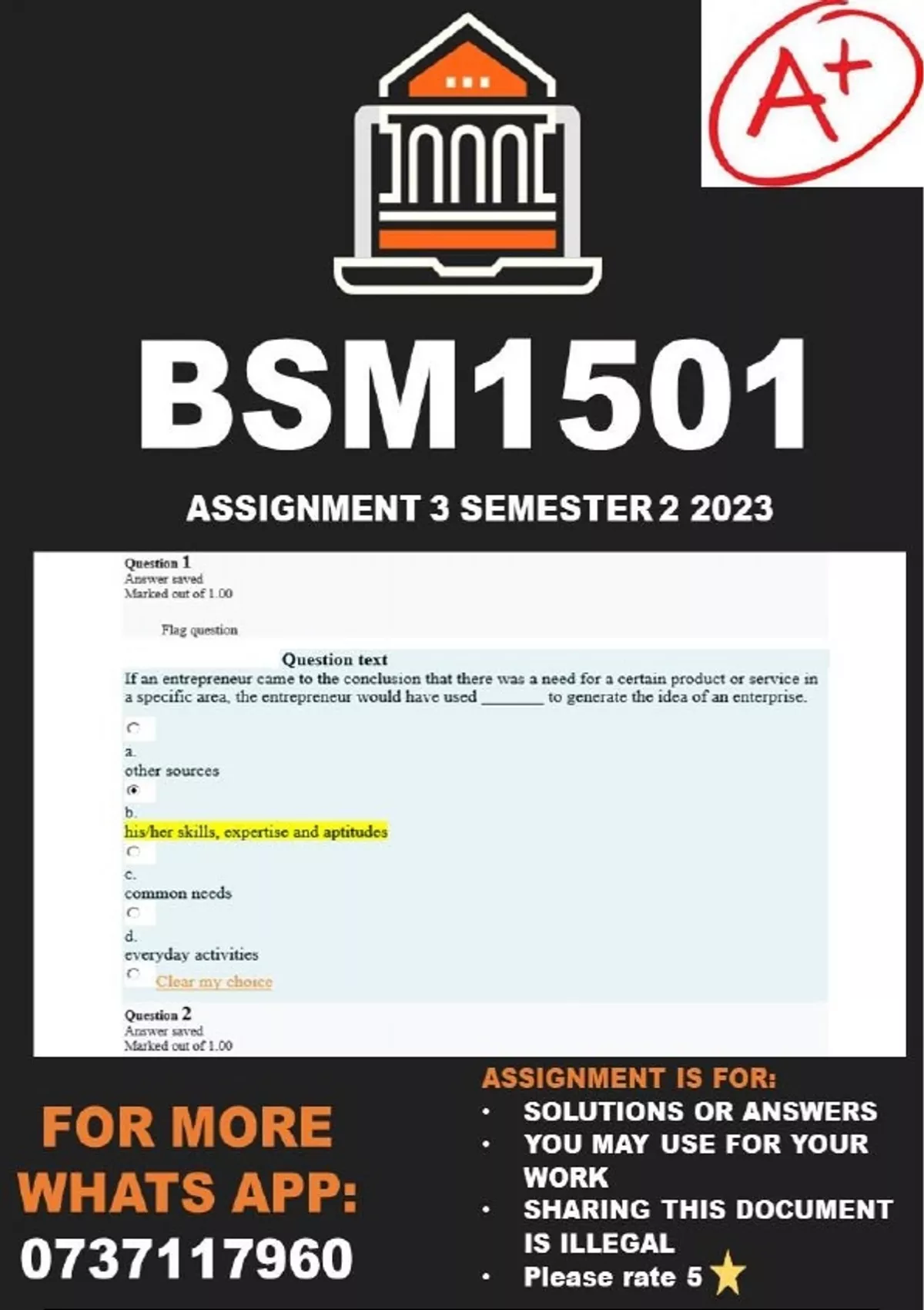 BSM1501 Assignment 3 Semester 2 2023 (Answers) QUESTIONS ASKED: Time left 0:24:24 Question 1 Answer saved Marked out of 1.00 Flag question Question text If an entrepreneur came to the conclusion that there was a need for a certain product or service in a specific area, the entrepreneur would have used _______ to generate the idea of an enterprise. a. other sources b. his/her skills, expertise and aptitudes c. common needs d. everyday activities Clear my choice Question 2 Answer saved Marked out of 1.00 Flag question Question text An entrepreneur worked in a certain industry for eight years. To generate a business idea of starting his own enterprise, the entrepreneur used his/her _______. a. skills b. expertise c. aptitudes d. talents Question 3 Not yet answered Marked out of 1.00 Flag question Question text A bow-tie diagram could have been used to develop the entrepreneur’s idea in terms of the _______ of the idea. a. viability b. market potential c. essence d. feasibility Question 4 Not yet answered Marked out of 1.00 Flag question Question text An entrepreneur would do a feasibility study to _______. a. do a general examination of an idea b. determine the market potential of an idea c. determine the profit potential of an idea d. do an in-depth investigation of an idea Question 5 Not yet answered Marked out of 1.00 Flag question Question text An entrepreneur would have used a bow-tie diagram to develop and evaluate a business idea in terms of _______. a. cost effectiveness b. his/her ability to implement the idea c. the possible combination of ideas d. profitability Clear my choice Question 6 Not yet answered Marked out of 1.00 Flag question Question text An entrepreneur identifies an opportunity during the _______ stage in the creation of an enterprise. a. idea b. implementation c. planning d. viability Question 7 Not yet answered Marked out of 1.00 Flag question Question text An entrepreneur registers an enterprise as a sole proprietorship during the _______ stage in the creation of the enterprise. a. idea b. planning c. implementation d. feasibility Question 8 Not yet answered Marked out of 1.00 Flag question Question text If an entrepreneur is qualified in his field and went for training, the entrepreneur would use his/her ______ to generate the idea of the enterprise. a. expertise b. natural talents c. aptitudes d. skills Question 9 Not yet answered Marked out of 1.00 Flag question Question text To start an enterprise, the entrepreneur has to come up with many original ideas. This relates to the entrepreneur’s ability to _______. a. apply divergent thinking b. apply convergent thinking c. write her ideas down d. actively seek ideas Question 10 Not yet answered Marked out of 1.00 Flag question Question text An entrepreneur will apply for a long-term loan to buy a new building during the _______ stage in the creation of an enterprise. a. viability b. idea c. planning d. implementation Question 11 Answer saved Marked out of 5.00 Flag question Question text Match the following concepts with the correct description. Activ ely seek ideas