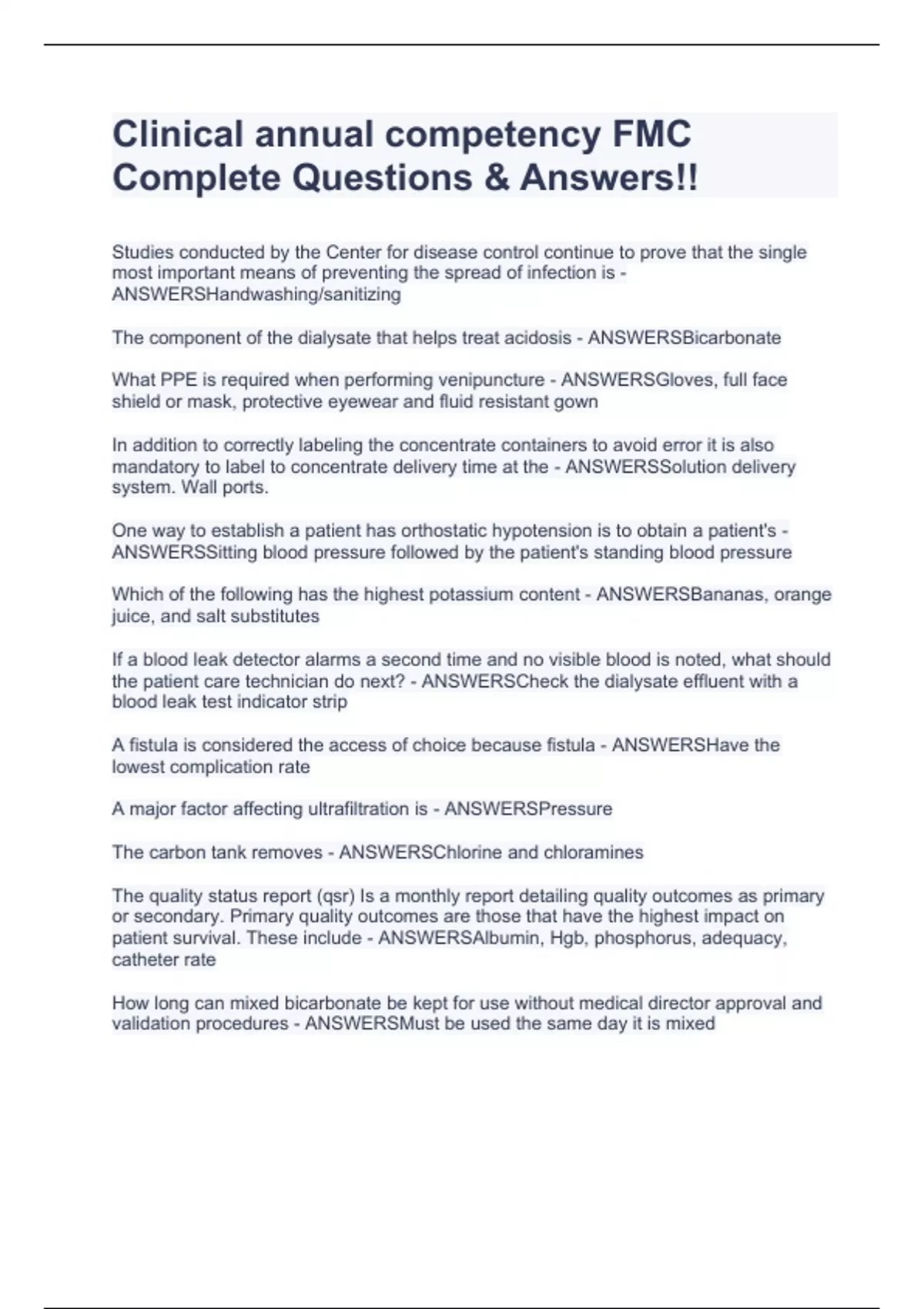 Studies conducted by the Center for disease control continue to prove that the single most important means of preventing the spread of infection is - ANSWERSHandwashing/sanitizing The component of the dialysate that helps treat acidosis - ANSWERSBicarbonate What PPE is required when performing venipuncture - ANSWERSGloves, full face shield or mask, protective eyewear and fluid resistant gown In addition to correctly labeling the concentrate containers to avoid error it is also mandatory to label to concentrate delivery time at the - ANSWERSSolution delivery system. Wall ports. One way to establish a patient has orthostatic hypotension is to obtain a patient's - ANSWERSSitting blood pressure followed by the patient's standing blood pressure Which of the following has the highest potassium content - ANSWERSBananas, orange juice, and salt substitutes If a blood leak detector alarms a second time and no visible blood is noted, what should the patient care technician do next? - ANSWERSCheck the dialysate effluent with a blood leak test indicator strip