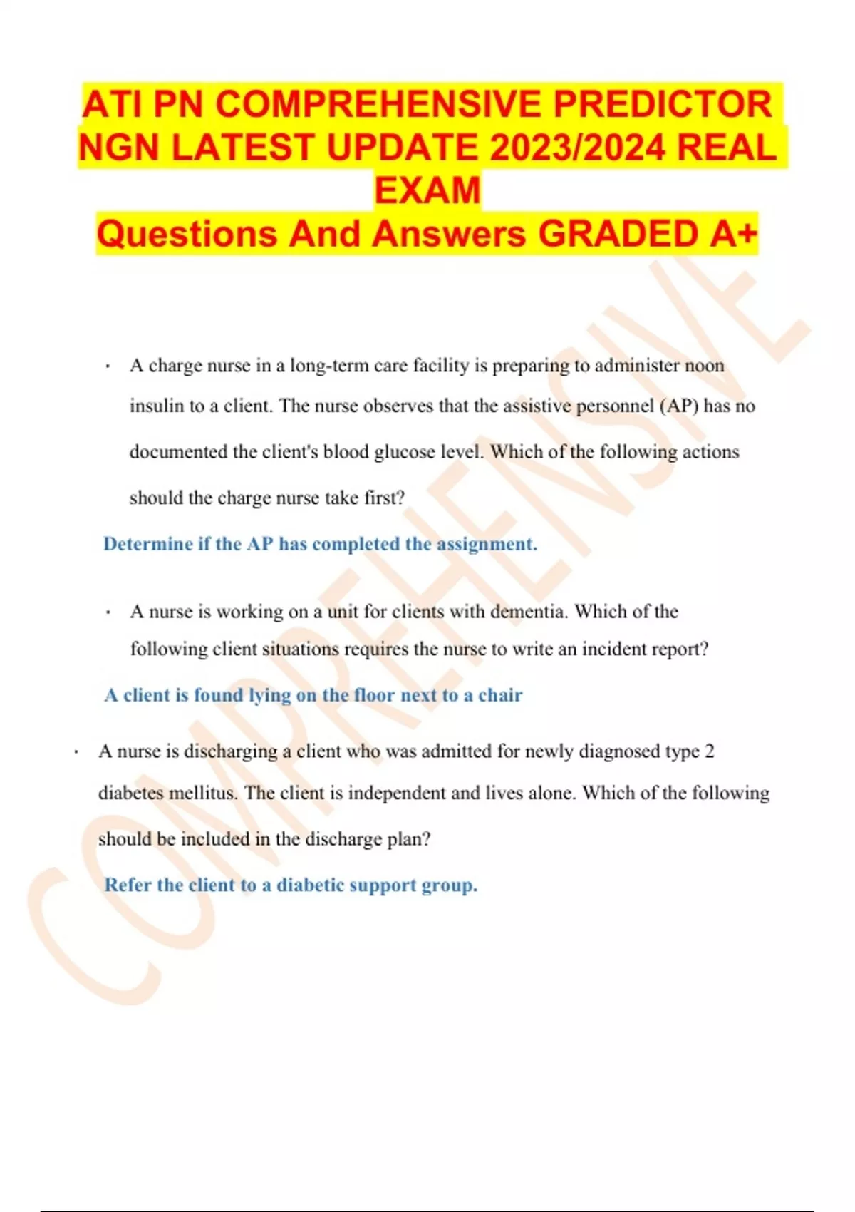 ATI PN COMPREHENSIVE PREDICTOR NGN LATEST UPDATE 2023/2024 REAL EXAM Questions And Answers GRADED A+ •A charge nurse in a long-term care facility is preparing to administer noon insulin to a client. The nurse observes that the assistive personnel (AP) has no documented the client's blood glucose level. Which of the following actions should the charge nurse take first? Determine if the AP has completed the assignment. •A nurse is working on a unit for clients with dementia. Which of the following client situations requires the nurse to write an incident report? A client is found lying on the floor next to a chair •A nurse is discharging a client who was admitted for newly diagnosed type 2 diabetes mellitus. The client is independent and lives alone. Which of the following should be included in the discharge plan? Refer the client to a diabetic support group. •A nurse is caring for a group of clients, which of the following can be assigned to an assistive personnel? Collecting a stool specimen two tests for occult blood •A nurse is caring for a client who has type 2 diabetes mellitus and a blood glucose level of 60 mg/dL. For which of the following findings should the nurse monitor? Fasting plasma glucose level •A female client who is an abusive marriage has discusses with the nurse strategies to prevent this abuse. Which of the following client statements indicate an understanding of an appropriate strategy? "I need to recognize the signs that my husband is becoming abusive." c. "I need to identify what triggers my husband's anger to prevent his abuse."