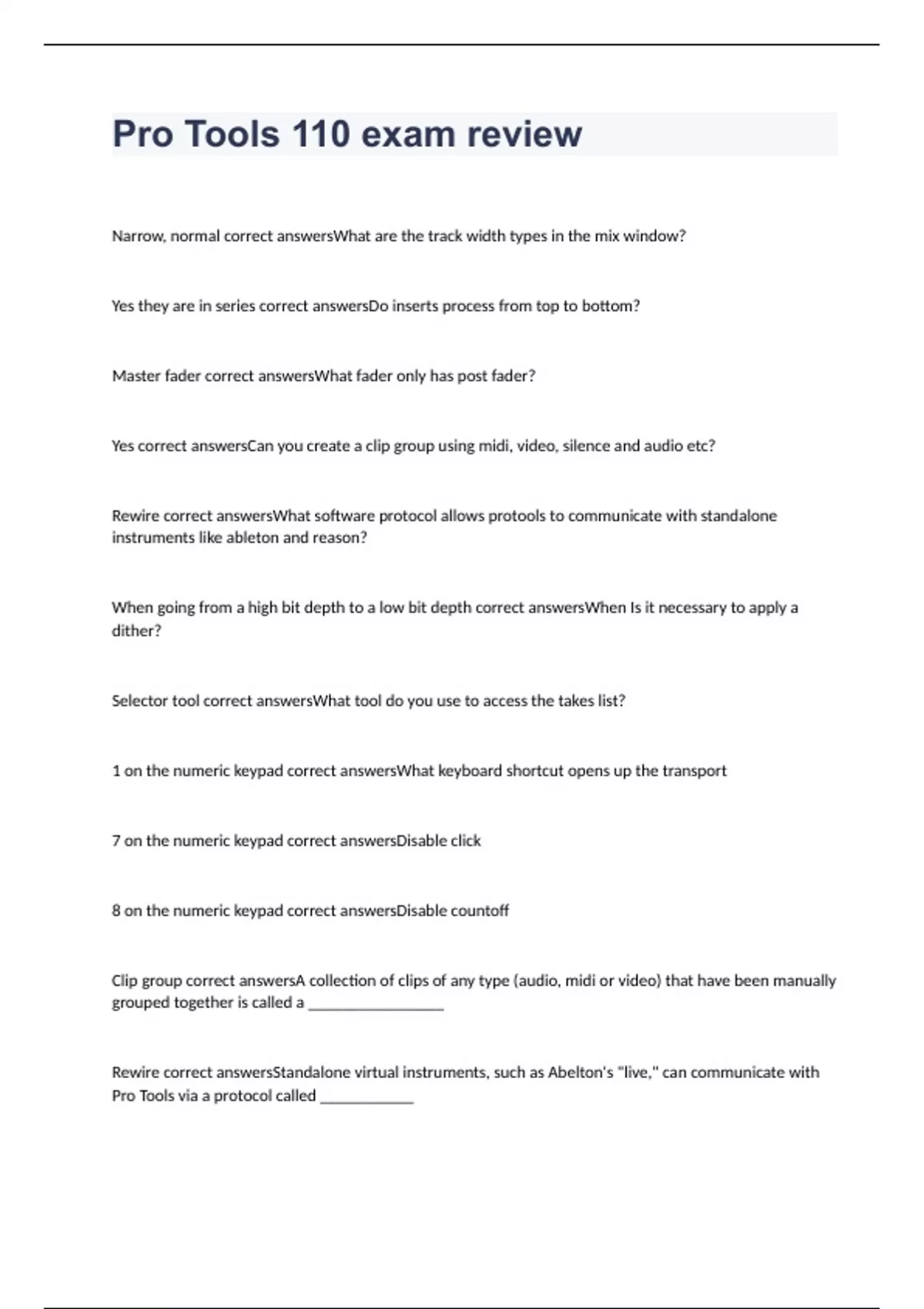 Narrow, normal correct answersWhat are the track width types in the mix window? Yes they are in series correct answersDo inserts process from top to bottom? Master fader correct answersWhat fader only has post fader? Yes correct answersCan you create a clip group using midi, video, silence and audio etc? Rewire correct answersWhat software protocol allows protools to communicate with standalone instruments like ableton and reason? When going from a high bit depth to a low bit depth correct answersWhen Is it necessary to apply a dither? Selector tool correct answersWhat tool do you use to access the takes list? 1 on the numeric keypad correct answersWhat keyboard shortcut opens up the transport 7 on the numeric keypad correct answersDisable click