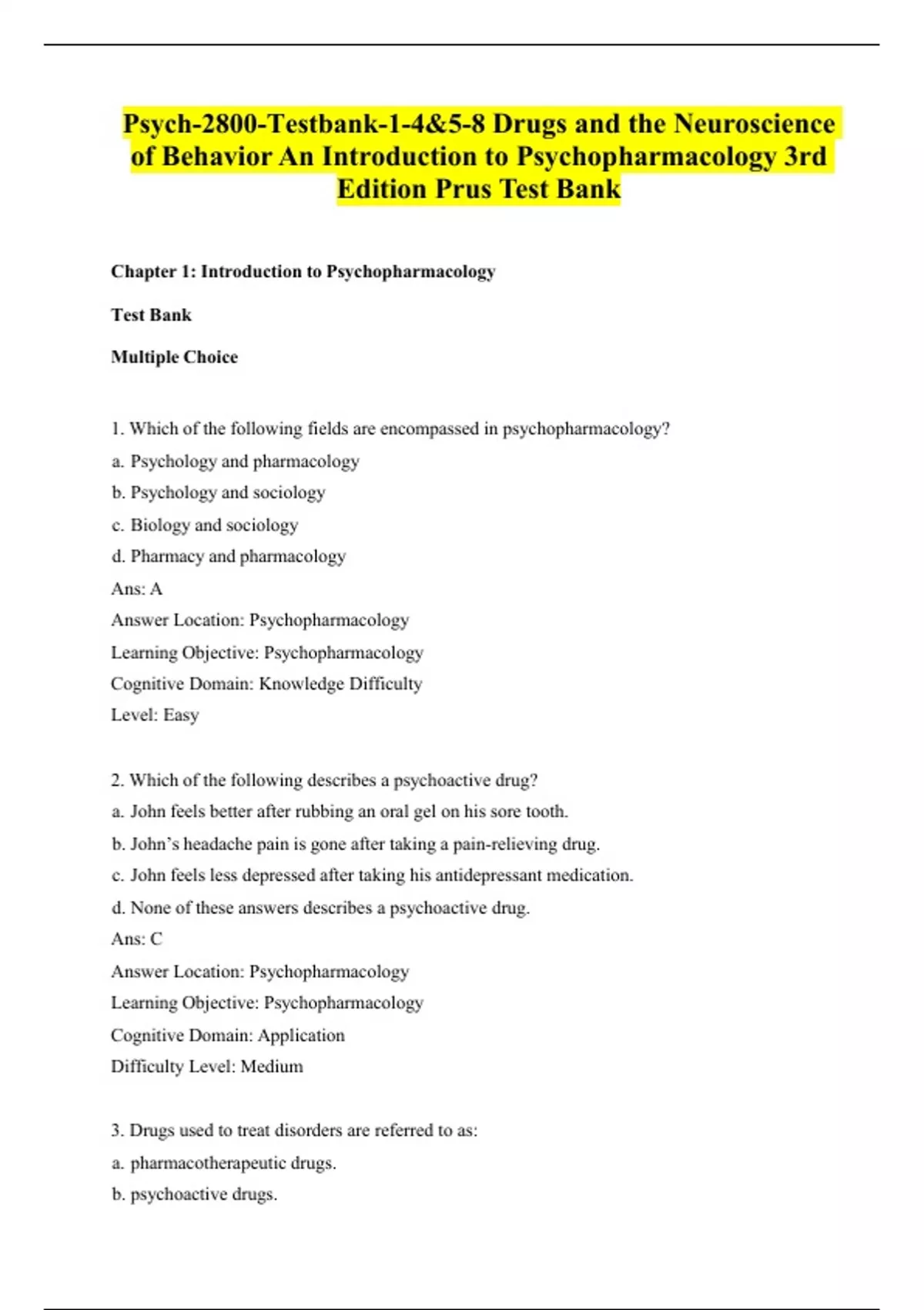 Psych-2800-Testbank-1-4&5-8 Drugs and the Neuroscience of Behavior An Introduction to Psychopharmacology 3rd Edition Prus Test Bank 1.Which of the following fields are encompassed in psychopharmacology? a.Psychology and pharmacology b.Psychology and sociology c.Biology and sociology d.Pharmacy and pharmacology Ans: A Answer Location: Psychopharmacology Learning Objective: Psychopharmacology Cognitive Domain: Knowledge Difficulty Level: Easy 2.Which of the following describes a psychoactive drug? a.John feels better after rubbing an oral gel on his sore tooth. b.John’s headache pain is gone after taking a pain-relieving drug. c.John feels less depressed after taking his antidepressant medication. d.None of these answers describes a psychoactive drug. Ans: C Answer Location: Psychopharmacology Learning Objective: Psychopharmacology Cognitive Domain: Application Difficulty Level: Medium 3.Drugs used to treat disorders are referred to as: acotherapeutic drugs. oactive drugs. native medicines. ational drugs. Ans: A Answer Location: Why read a book on psychopharmacology? Learning Objective: Psychopharmacology Cognitive Domain: Knowledge Difficulty Level: Medium