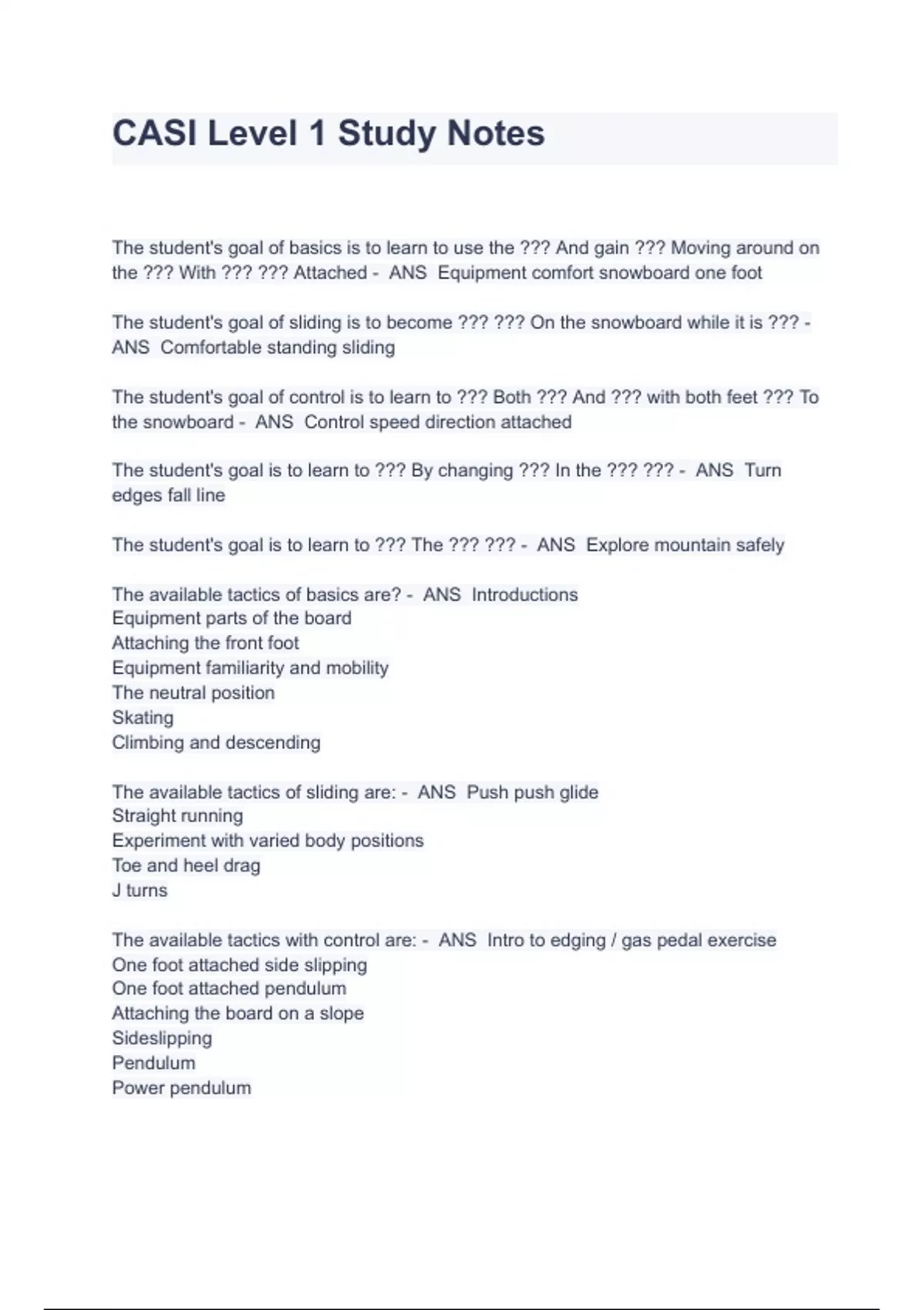 CASI Level 1 Study Notes Verified Questions With Correct Answers The student's goal of basics is to learn to use the ??? And gain ??? Moving around on the ??? With ??? ??? Attached - ANS Equipment comfort snowboard one foot The student's goal of sliding is to become ??? ??? On the snowboard while it is ??? - ANS Comfortable standing sliding The student's goal of control is to learn to ??? Both ??? And ??? with both feet ??? To the snowboard - ANS Control speed direction attached The student's goal is to learn to ??? By changing ??? In the ??? ??? - ANS Turn edges fall line The student's goal is to learn to ??? The ??? ??? - ANS Explore mountain safely The available tactics of basics are? - ANS Introductions Equipment parts of the board Attaching the front foot Equipment familiarity and mobility The neutral position Skating Climbing and descending The available tactics of sliding are: - ANS Push push glide Straight running Experiment with varied body positions Toe and heel drag J turns