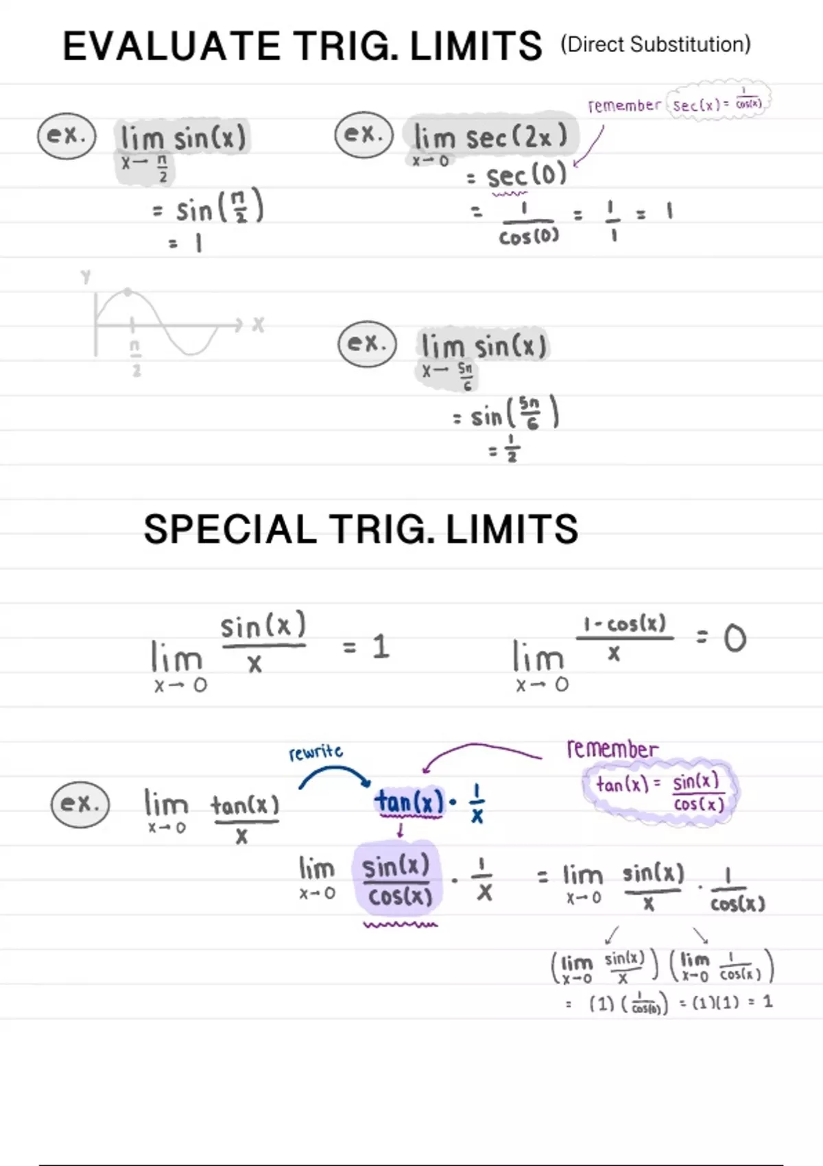 This guide gives a conceptual explanation of Trigonometric Limits and Special Trigonometric Limits. It also provides example problems and graphical representations.