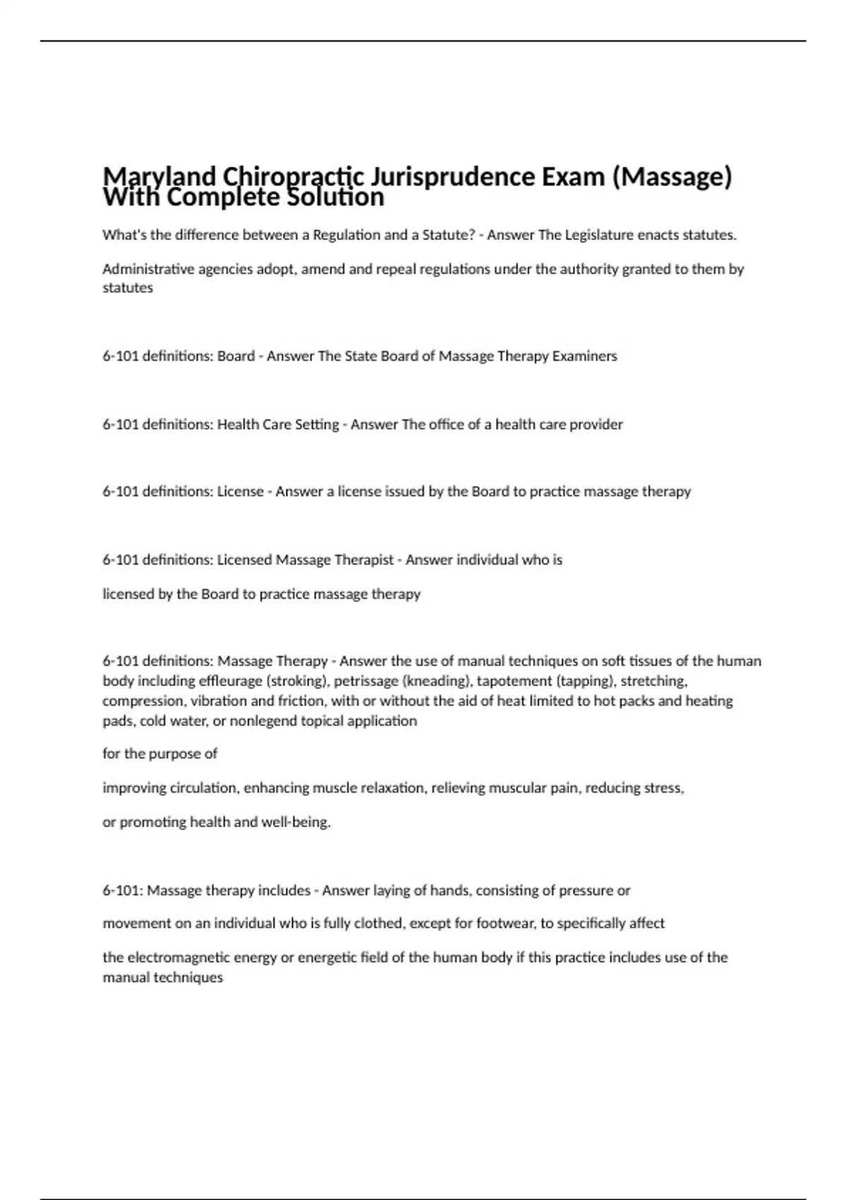 Maryland Chiropractic Jurisprudence Exam (Massage) With Complete Solution