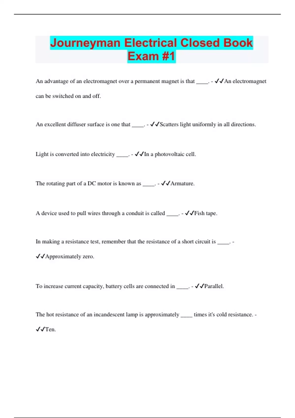 An advantage of an electromagnet over a permanent magnet is that ____. - An electromagnet can be switched on and off. An excellent diffuser surface is one that ____. - Scatters light uniformly in all directions. Light is converted into electricity ____. - In a photovoltaic cell. The rotating part of a DC motor is known as ____. - Armature. A device used to pull wires through a conduit is called ____. - Fish tape. In making a resistance test, remember that the resistance of a short circuit is ____. - Approximately zero. To increase current capacity, battery cells are connected in ____. - Parallel. The hot resistance of an incandescent lamp is approximately ____ times it's cold resistance. - Ten.