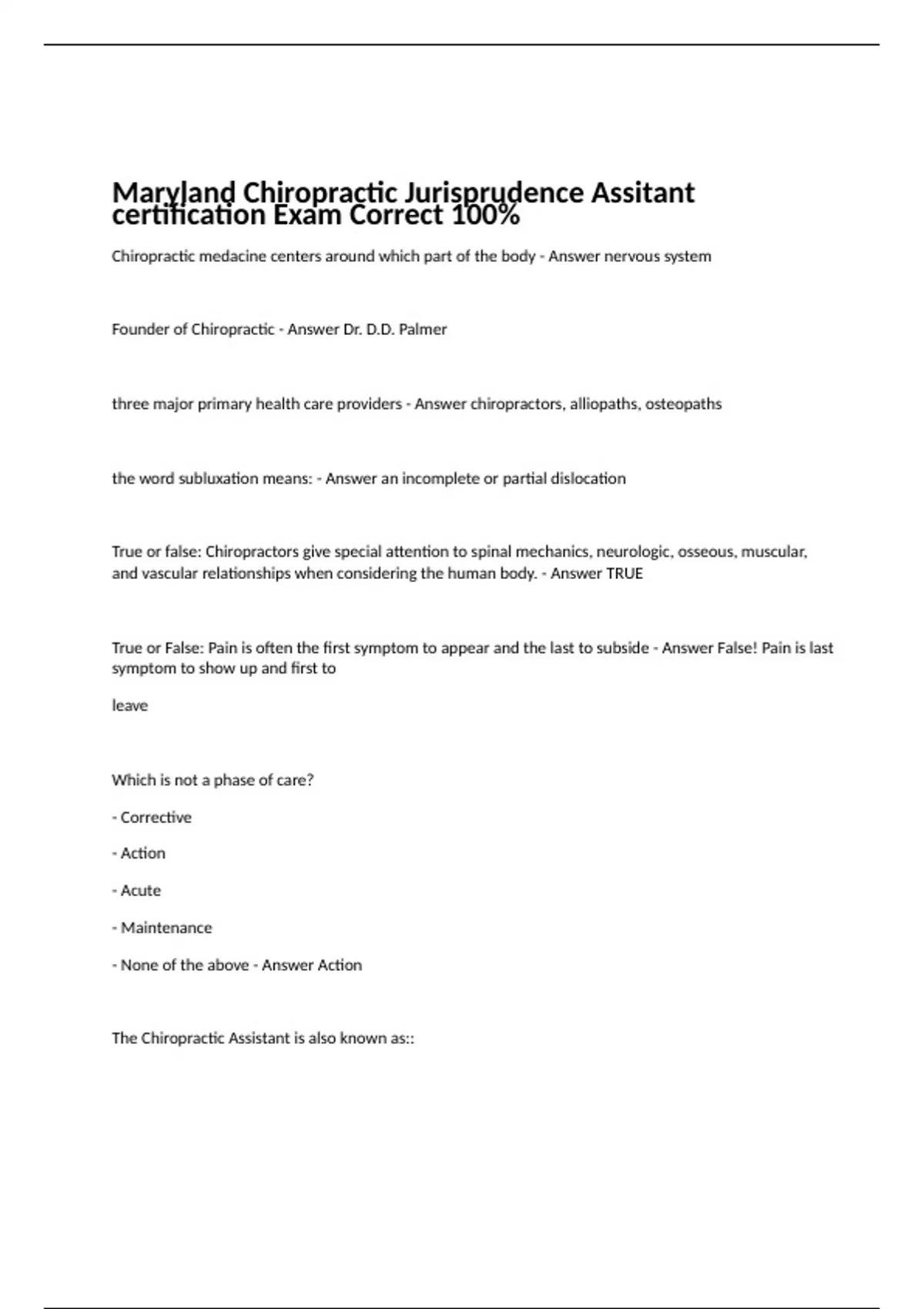Maryland Chiropractic Jurisprudence Assitant certification Exam Correct 100%