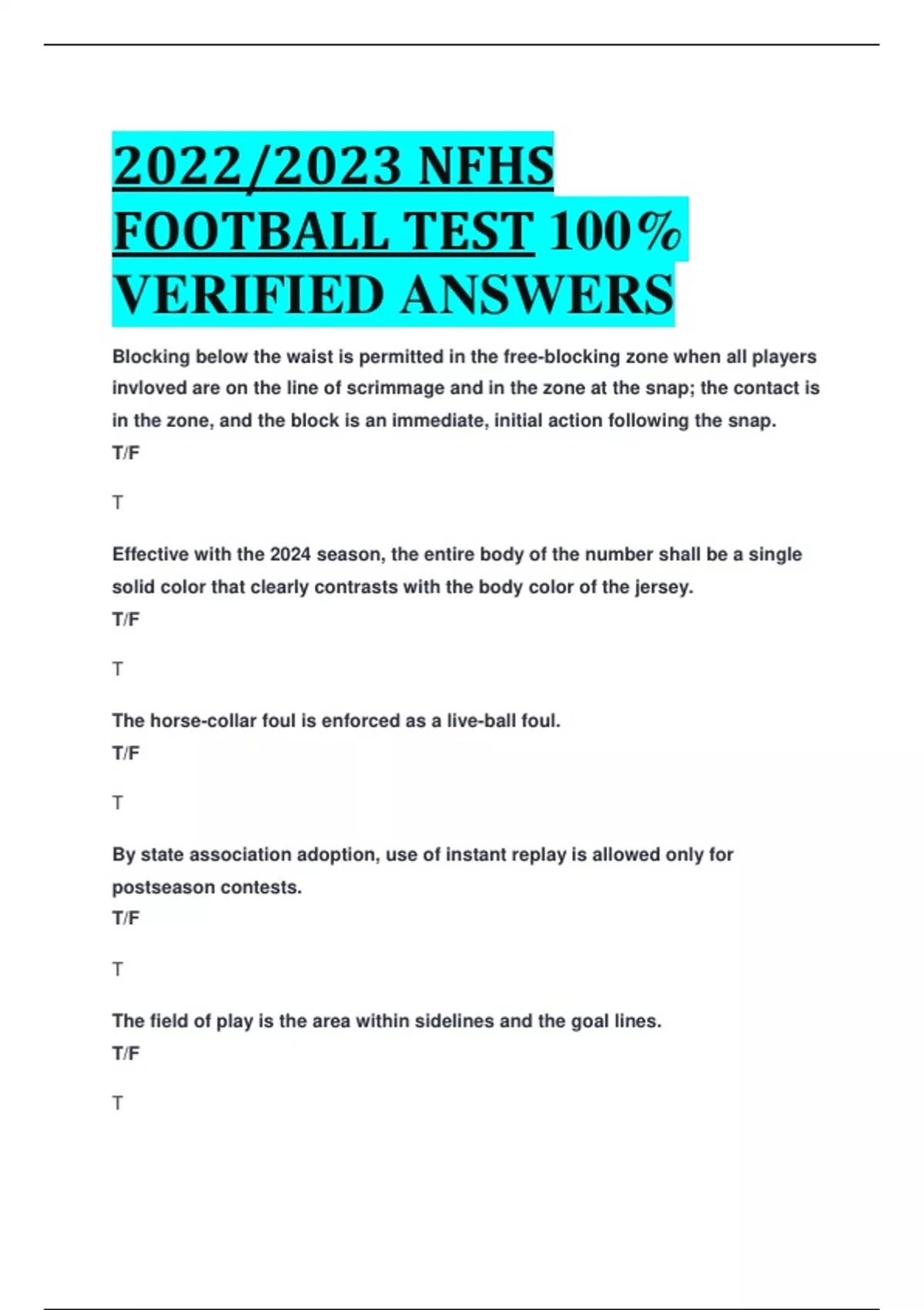 20222023 nfhs football test 100 verified answers