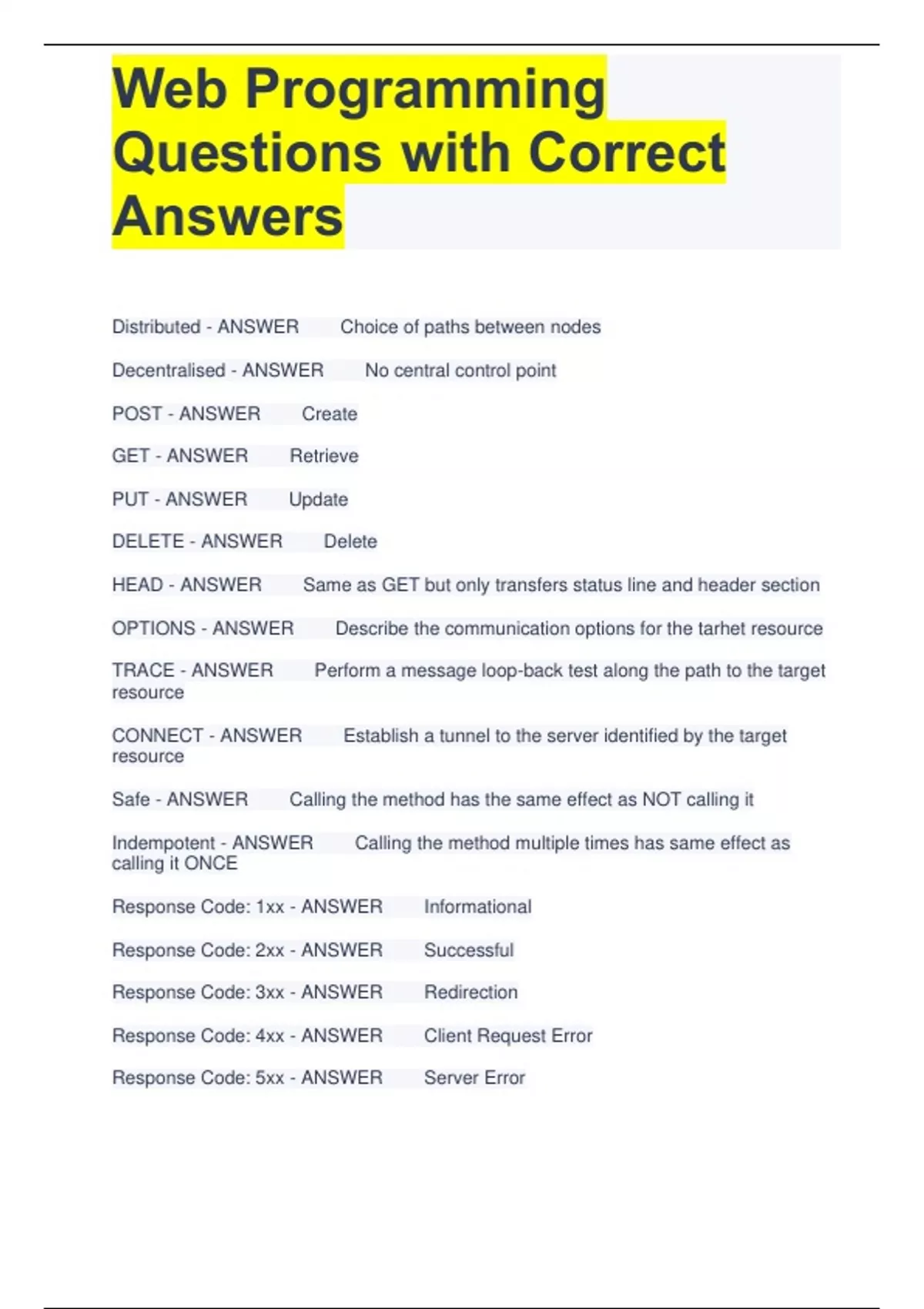 Web Programming Questions with Correct Answers Distributed - ANSWER Choice of paths between nodes Decentralised - ANSWER No central control point POST - ANSWER Create GET - ANSWER Retrieve PUT - ANSWER Update DELETE - ANSWER Delete HEAD - ANSWER Same as GET but only transfers status line and header section OPTIONS - ANSWER Describe the communication options for the tarhet resource TRACE - ANSWER Perform a message loop-back test along the path to the target resource CONNECT - ANSWER Establish a tunnel to the server identified by the target resource Safe - ANSWER Calling the method has the same effect as NOT calling it Indempotent - ANSWER Calling the method multiple times has same effect as calling it ONCE Response Code: 1xx - ANSWER Informational Response Code: 2xx - ANSWER Successful Response Code: 3xx - ANSWER Redirection Response Code: 4xx - ANSWER Client Request Error Response Code: 5xx - ANSWER Server Error