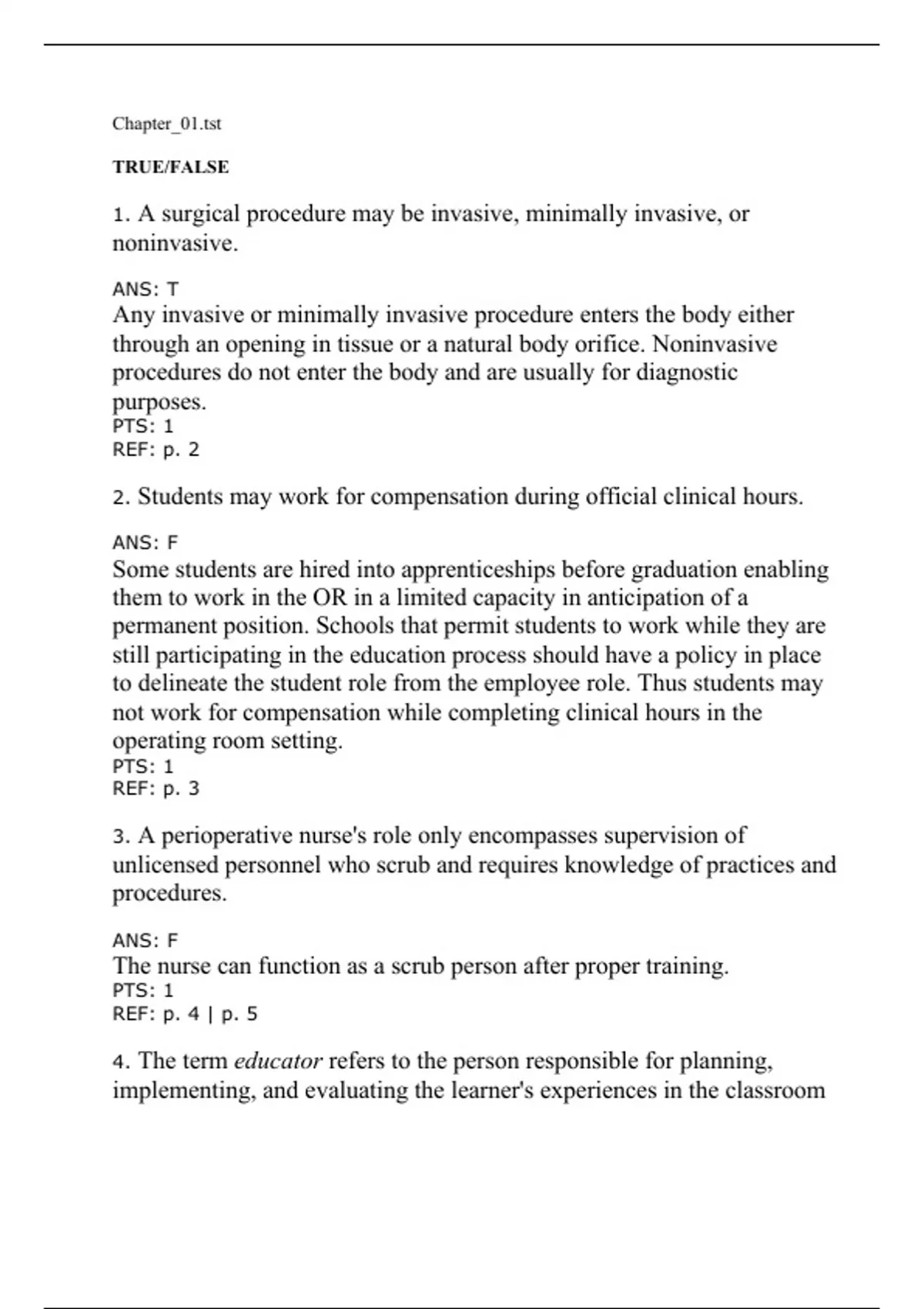 Test Bank for Berry & Kohn's Operating Room Technique, 14th Edition 14e by Nancymarie Phillips, Anita Hornacky. ISBN-13: 9149 Full Chapters test bank are included - Chap 1 to 45 (Complete Chapters) Section 1: Fundamentals of Theory and Practice 1. Perioperative Education 2. Foundations of Perioperative Patient Care Standards 3. Legal, Regulatory, and Ethical Issues Section 2: The Perioperative Patient Care Team 4. The Perioperative Patient Care Team and Professional Credentialing 5. The Surgical First Assistant 6. Administration of Perioperative Patient Care Services Section 3: The Patient as a Unique Individual 7. The Patient: The Reason for Your Existence 8. Perioperative Pediatrics 9. Perioperative Geriatrics Section 4: The Perioperative Environment 10. Physical Facilities 11. Ambulatory Surgery Centers and Alternative Surgical Locations 12. Care of the Perioperative Environment 13. Potential Sources of Injury to the Caregiver and the Patient Section 5: Surgical Asepsis and Sterile Technique 14. Surgical Microbiology and Antimicrobial Therapy 15. Principles of Aseptic and Sterile Technique 16. Appropriate Attire, Surgical Hand Hygiene, Gowning and Gloving 17. Decontamination and Disinfection 18. Sterilization Section 6: Surgical Instrumentation and Equipment 19. Surgical Instrumentation 20. Specialized Surgical Equipment Section 7: Preoperative Patient Care 21. Preoperative Preparation of the Patient 22. Diagnostics, Specimens, and Oncologic Considerations Section 8: Pharmacology and Anesthesia 23. Surgical Pharmacology 24. Anesthesia: Techniques and Agents Section 9: Intraoperative Patient Care 25. Coordinated Roles of the Scrub Person and the Circulating Nurse 26. Positioning, Prepping, and Draping the Patient 27. Physiologic Maintenance and Monitoring of the Perioperative Patient Section 10: Surgical Site Management 28. Surgical Incisions, Implants, and Wound Closure 29. Wound Healing and Hemostasis Section 11: Perianesthesia and Postprocedural Patient Care 30. Postoperative Patient Care 31. Potential Perioperative Complications Section 12: Surgical Specialties 32. Endoscopy and Robotic-Assisted Surgery 33. General Surgery 34. Gynecologic and Obstetric Surgery 35. Urologic Surgery 36. Orthopedic Surgery 37. Neurosurgery of the Brain and Peripheral Nerves 38. Spinal Surgery 39. Ophthalmic Surgery 40. Plastic and Reconstructive Surgery 41. Otorhinolaryngologic and Head and Neck Surgery 42. Thoracic Surgery 43. Cardiac Surgery 44. Vascular Surgery 45. Organ Procurement and Transplantation