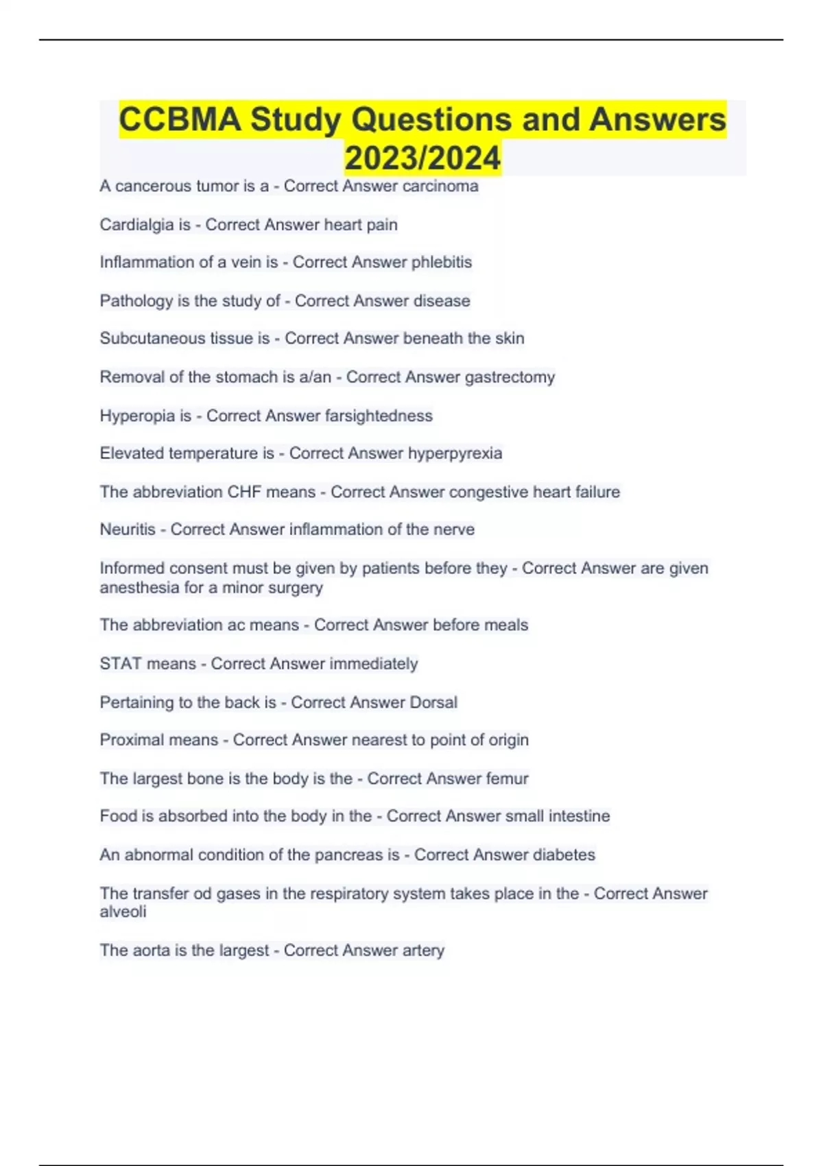A cancerous tumor is a - Correct Answer carcinoma Cardialgia is - Correct Answer heart pain Inflammation of a vein is - Correct Answer phlebitis Pathology is the study of - Correct Answer disease Subcutaneous tissue is - Correct Answer beneath the skin Removal of the stomach is a/an - Correct Answer gastrectomy Hyperopia is - Correct Answer farsightedness Elevated temperature is - Correct Answer hyperpyrexia The abbreviation CHF means - Correct Answer congestive heart failure Neuritis - Correct Answer inflammation of the nerve Informed consent must be given by patients before they - Correct Answer are given anesthesia for a minor surgery The abbreviation ac means - Correct Answer before meals STAT means - Correct Answer immediately Pertaining to the back is - Correct Answer Dorsal Proximal means - Correct Answer nearest to point of origin The largest bone is the body is the - Correct Answer femur Food is absorbed into the body in the - Correct Answer small intestine An abnormal condition of the pancreas is - Correct Answer diabetes The transfer od gases in the respiratory system takes place in the - Correct Answer alveoli The aorta is the largest - Correct Answer artery