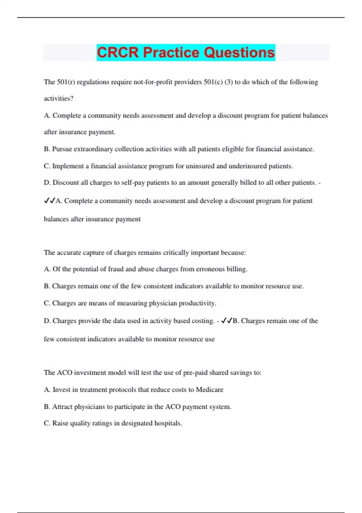 The 501(r) regulations require not-for-profit providers 501(c) (3) to do which of the following activities? A. Complete a community needs assessment and develop a discount program for patient balances after insurance payment. B. Pursue extraordinary collection activities with all patients eligible for financial assistance. C. Implement a financial assistance program for uninsured and underinsured patients. D. Discount all charges to self-pay patients to an amount generally billed to all other patients. - A. Complete a community needs assessment and develop a discount program for patient balances after insurance payment The accurate capture of charges remains critically important because: A. Of the potential of fraud and abuse charges from erroneous billing. B. Charges remain one of the few consistent indicators available to monitor resource use. C. Charges are means of measuring physician productivity. D. Charges provide the data used in activity based costing. - B. Charges remain one of the few consistent indicators available to monitor resource use The ACO investment model will test the use of pre-paid shared savings to: A. Invest in treatment protocols that reduce costs to Medicare B. Attract physicians to participate in the ACO payment system. C. Raise quality ratings in designated hospitals.