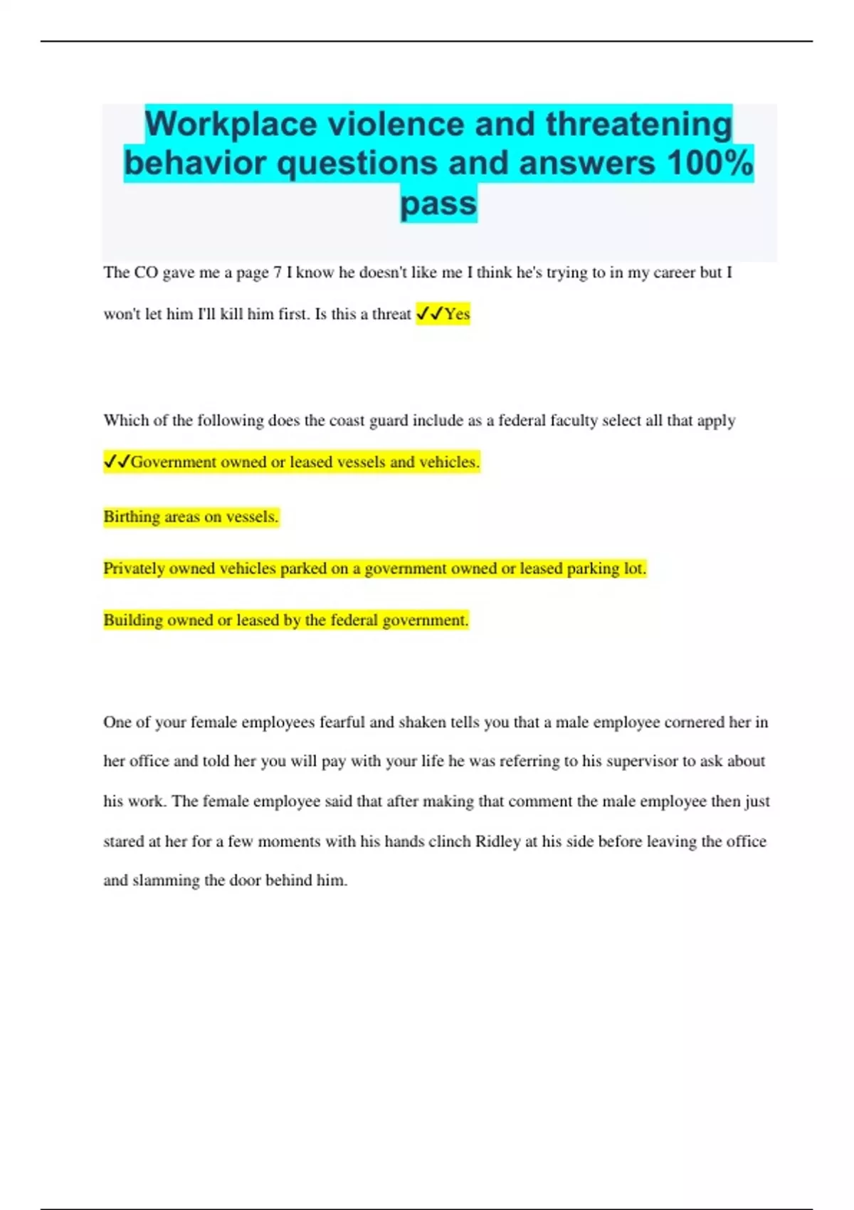 Workplace violence and threatening behavior questions and answers 100% pass The CO gave me a page 7 I know he doesn't like me I think he's trying to in my career but I won't let him I'll kill him first. Is this a threat Yes Which of the following does the coast guard include as a federal faculty select all that apply Government owned or leased vessels and vehicles. Birthing areas on vessels. Privately owned vehicles parked on a government owned or leased parking lot. Building owned or leased by the federal government. One of your female employees fearful and shaken tells you that a male employee cornered her in her office and told her you will pay with your life he was referring to his supervisor to ask about his work. The female employee said that after making that comment the male employee then just stared at her for a few moments with his hands clinch Ridley at his side before leaving the office and slamming the door behind him. How would you respond to the situation? Report the incident to the EAPC for their assistance. Call the security or a local law-enforcement. Notify the command. Which of the following apply to violent behavior in the workplace? Violence requires action. Violence can be prevented. Violence is recognizable. As a supervisor it is your responsibility to: Maintain awareness. Recognize the signs of escalation. Prevent violent behavior through early response. Two of your employees have been involved in a romantic relationship. The female employee breaks off the relationship but the male employee won't leave her alone she finally has a restraining order served on him at work. After the police officer served the restraining order the male employee loses control enters the female employees cubicle and hits her several times and walks away. A coworker witnessed the attack and can be cooperated her account of the event the victim runs to your office for assistance. Which of these actions are appropriate response to this workplace violence situation? Call local law enforcement. Call Security if available. Notify your chain of command. Which of the following is authorized in the workplace? Knife with a 2 inch blade. One of your employees tells you that the other employee has been intimidating him and his in your face behavior he says that the alleged perpetrator has stood over his desk in a menacing way as physically crowded him and makes medicine gestures. The alleged perpetrator is an average former somewhat of a loner but there have been no behavior problems. How would you respond to the situation? Counsel the employee about other perceptions of his behavior and his inappropriate Ness in the workplace. Document and monitor the situation. . What are the possible consequences for bringing an unauthorized weapon into a federal facility? Fine and imprisonment Possible you MC for military members If you the supervisor observe any visible warning signs of violent behavior which of the following actions would be required? Council the employee. Observe the employee. After workplace violence training was conducted at the agency during which the intervention was emphasized an employee asked his supervisor for advice on dealing with his senior coworker he said the coworker was in the habit of shouting and making demeaning remarks at the employee in the office. The senior coworker was skilled in twisting words around and manipulating situations to his advantage for example when employees would ask him for advice on a topic in this area of expertise he would tell them to use their own common sense then they finished the assignment he would make demeaning remarks about them and speak loudly about how they had done their work wrong. How would you respond to the situation Continue to monitor the situation. Council offender and inform him that rude and belligerent behavior will not be tolerated. Consult with your EAPC about strategies and consider using EAP for additional supervisory consultation as needed to defuse the situation. Which of the following statements might be a visible sign of someone who may be a candidate of violent behavior? Unknown Which of the following actions represent threatening behavior Sending an email to a coworker that says if you talk to the boss your dead. Telling a coworker that he should watch his back. Continue with blocking the door so that the coworker cannot pass through. Which of the following statements might be able to double sign of someone that may be a candidate for about violent behavior.? Employee I don't care what my boss says if he knows what's good for him he'll leave me alone I could easily take him. Which of the following behaviors are visible warning signs that may be exhibited by someone before committing a violent an act of violence Irritable behavior. Evidence of drug abuse or alcoholism. Acting or attempting to sabotage destroyed by only damage or do you face real or personal property at the workplace is an example of which of the following Workplace violence Besides coworker coworker which of the following groups are most likely to be possible perpetrators of violent behavior Customers Someone from a personal relationship. Case study you are counseling one of your employees about her frequent unscheduled absences when she told you the story of what she's been going through for the past year. She broke up with her boyfriend a year ago and has been stocking her ever since he told her several times a week but she hangs up immediately he shows up whenever she goes on the weekend and stares at her from a distance he often parks his car down the block from her home and just sits there twice he's watched her as she left the workplace he's made it known he has a gun. Which of these actions do you think appropriate deal with the situation? Ask the commander to convene a critical incident team to assist in handling the situation Refer her to local law-enforcement. Refer her to local EAPC The CEO gave me a page 7 I know he doesn't like me. I thin