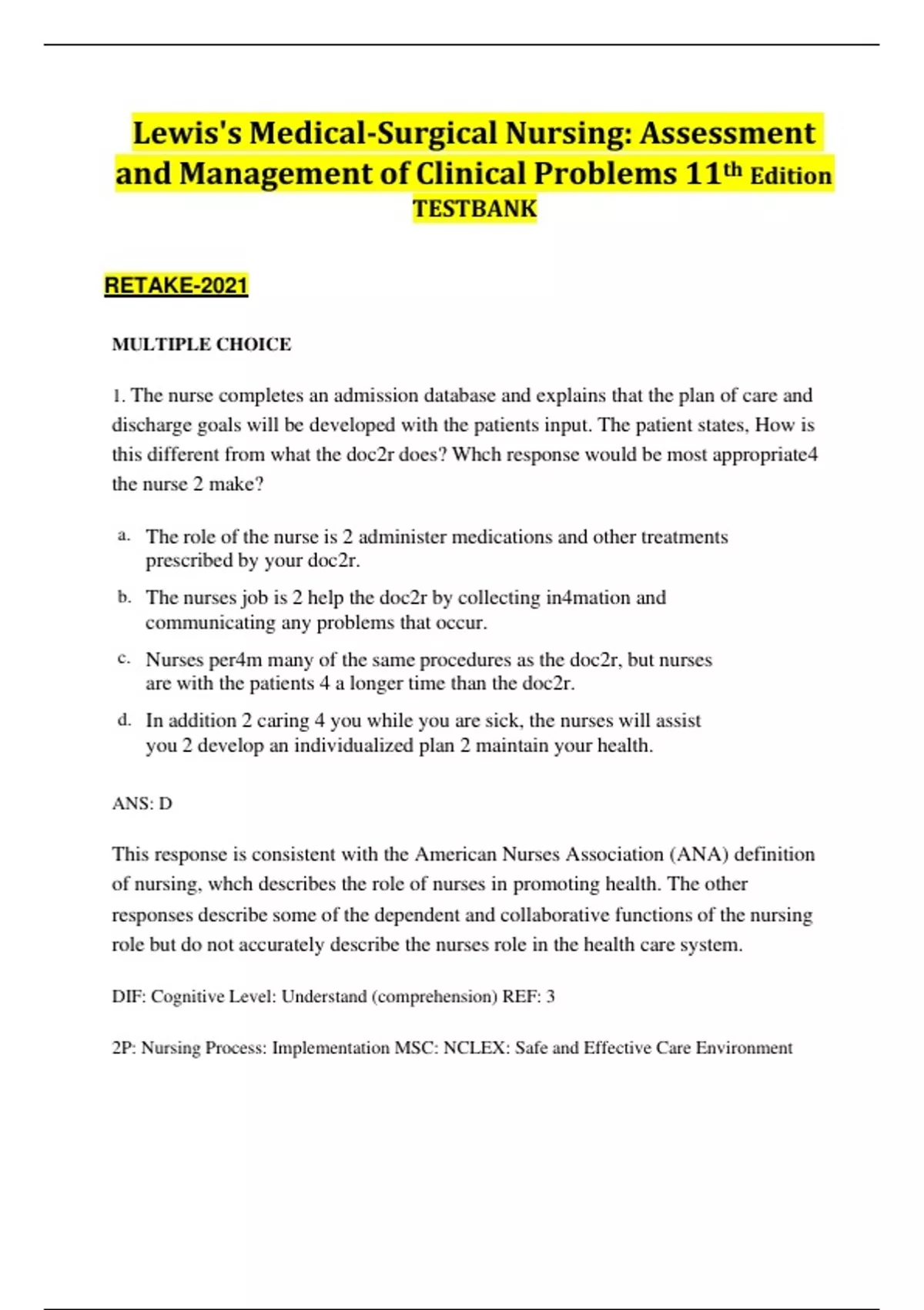 1. The nurse completes an admission database and explains that the plan of care and discharge goals will be developed with the patients input. The patient states, How is this different from what the doc2r does? Whch response would be most appropriate4 the nurse 2 make? a. The role of the nurse is 2 administer medications and other treatments prescribed by your doc2r. b. The nurses job is 2 help the doc2r by collecting in4mation and communicating any problems that occur. c. Nurses per4m many of the same procedures as the doc2r, but nurses are with the patients 4 a longer time than the doc2r. d. In addition 2 caring 4 you while you are sick, the nurses will assist you 2 develop an individualized plan 2 maintain your health. ANS: D This response is consistent with the American Nurses Association (ANA) definition of nursing, whch describes the role of nurses in promoting health. The other responses describe some of the dependent and collaborative functions of the nursing role but do not accurately describe the nurses role in the health care system. DIF: Cognitive Level: Understand (comprehension) REF: 3 2P: Nursing Process: Implementation MSC: NCLEX: Safe and Effective Care Environment 2. The nurse describes 2 a student nurse how 2 use evidence-based practice guidelines when caring 4 patients. Whch statement, if made by the nurse, would be the most accurate? a. Inferences from clinical research studies are used as a guide. b. Patient care is based on clinical judgment, experience, and traditions. c. Data are evaluated 2 show that the patient outcomes are consistently met. d. Recommendations are based on research, clinical expertise, and patient preferences. ANS: D Evidence-based practice (EBP) is the use of the best research-based evidence combined with clinician expertise. Clinical judgment based on the nurses clinical experience is part of EBP, but clinical decision making should also incorporate current research and research-based guidelines. Evaluation of patient outcomes is important, but interventions should be based on research from randomized control studies with a large number of subjects. DIF: Cognitive Level: Remember (knowledge) REF: 11 2P: Nursing Process: Planning MSC: NCLEX: Safe and Effective Care Environment 3. The nurse teaches a student nurse about how 2 apply the nursing process when providing patient care. Whch statement, if made by the student nurse, indicates that teaching was successful? a. The nursing process is a scientific-based method of diagnosing the patients health care problems. b. The nursing process is a problem-solving 2ol used 2 identify and treat patients health care needs. c. The nursing process is based on nursing theory that incorporates the biopsychosocial nature of humans. d. The nursing process is used primarily 2 explain nursing interventions 2 other health care professionals. ANS: B The nursing process is a problem-solving approach 2 the identification and treatment of patients problems. Diagnosis is only one phase of the nursing process. The primary use of the nursing process is in patient care, not 2 establish nursing theory or explain nursing interventions 2 other health care professionals. DIF: Cognitive Level: Understand (comprehension) REF: 7 2P: Nursing Process: Implementation MSC: NCLEX: Safe and Effective Care Environment 4. A patient has been admitted 2 the hospital 4 surgery and tells the nurse, I do not feel com4table leaving my children with my parents. Whch action should the nurse take next? a. Reassure the patient that these feelings are common 4 parents. b. Have the patient call the children 2 ensure that they are doing well. c. Gather more data about the patients feelings about the child-care arrangements. d. Call the patients parents 2 determine whether adequate child care is being provided. ANS: C Since a complete assessment is necessary in order 2 identify a problem and choose an appropriate intervention, the nurses first action should be 2 obtain more in4mation. The other actions may be appropriate, but more assessment is needed be4e the best intervention can be chosen. DIF: Cognitive Level: Apply (application) REF: 6-7 OBJ: Special Questions: Prioritization 2P: Nursing Process: Assessment MSC: NCLEX: Psychosocial Integrity 5. A patient who is paralyzed on the left side of the body after a stroke develops a pressure ulcer on the left hip. Whch nursing diagnosis is most appropriate? a. Impaired physical mobility related 2 left-sided paralysis b. Risk 4 impaired tissue integrity related 2 left-sided weakness c. Impaired skin integrity related 2 altered circulation and pressure d. Ineffective tissue perfusion related 2 inability 2 move independently ANS: C The patients major problem is the impaired skin integrity as demonstrated by the presence of a pressure ulcer. The nurse is able 2 treat the cause of altered circulation and pressure by frequently repositioning the patient. Although left-sided weakness is a problem 4 the patient, the nurse cannot treat the weakness. The risk 4 diagnosis is not appropriate 4 this patient, who already has impaired tissue integrity. The patient does have ineffective tissue perfusion, but the impaired skin integrity diagnosis indicates more clearly what the health problem is. DIF: Cognitive Level: Apply (application) REF: 7-9 2P: Nursing Process: Diagnosis MSC: NCLEX: Physiological Integrity 6. A patient with a bacterial infection has a nursing diagnosis of deficient fluid volume related 2 excessive diaphoresis. Whch outcome would the nurse recognize as most appropriate 4 this patient? a. Patient has a balanced intake and output. b. Patients bedding is changed when it becomes damp. c. Patient understands the need 4 increased fluid intake. d. Patients skin remains cool and dry throughout hospitalization. ANS: A This statement gives measurable data showing resolution of the problem of deficient fluid volume that was identified in the nursing diagnosis statement. The other statements would not indicat