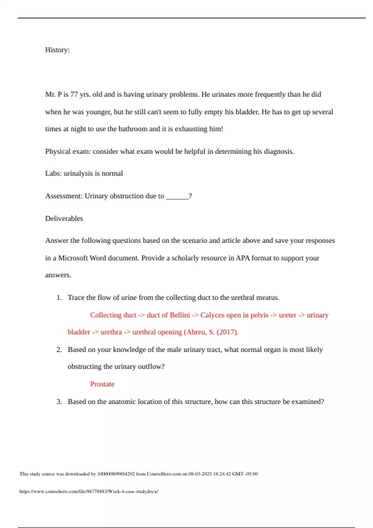 History: Mr. P is 77 yrs old and is having urinary problems. He urinates more frequently than he did when he was younger, but he still can't seem to fully empty his bladder. He has to get up several times at night to use the bathroom and it is exhausting him! Physical exam: consider what exam would be helpful in determining his diagnosis Labs: urinalysis is normal Assessment: Urinary obstruction due to ______? Instructions Answer the following questions based on the scenario and article above and save your responses in a Microsoft Word document. Provide a scholarly resource in APA format to support your answers. 1. Trace the flow of urine from the collecting duct to the urethral meatus. 2. Based on your knowledge of the male urinary tract, what normal organ is most likely obstructing the urinary outflow? 3. Based on the anatomic location of this structure, how can this structure be examined? 4. Based on your knowledge of anatomical differences, why are women more likely than men to get urinary tract infections? 5. Predict the consequences of the inability to empty the bladder.
