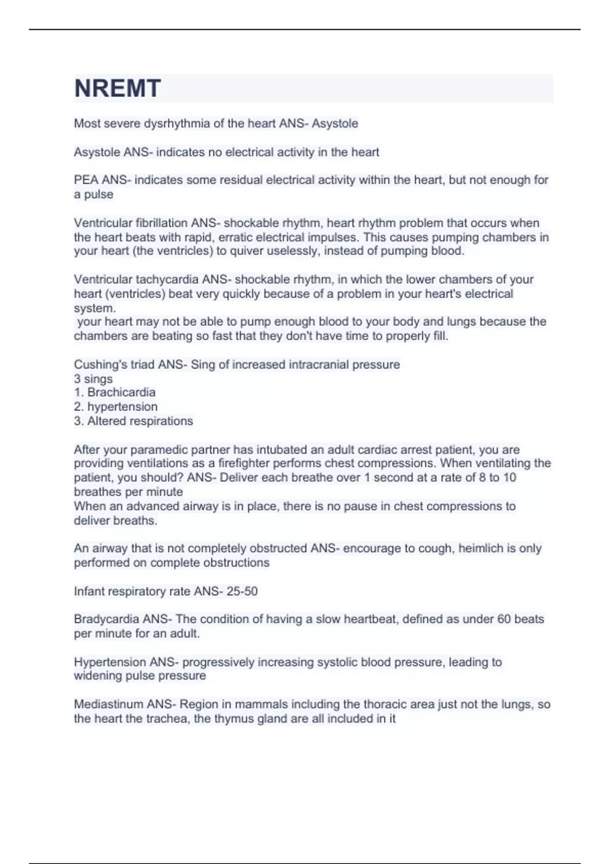 NREMT Most severe dysrhythmia of the heart ANS- Asystole Asystole ANS- indicates no electrical activity in the heart PEA ANS- indicates some residual electrical activity within the heart, but not enough for a pulse Ventricular fibrillation ANS- shockable rhythm, heart rhythm problem that occurs when the heart beats with rapid, erratic electrical impulses. This causes pumping chambers in your heart (the ventricles) to quiver uselessly, instead of pumping blood. Ventricular tachycardia ANS- shockable rhythm, in which the lower chambers of your heart (ventricles) beat very quickly because of a problem in your heart's electrical system. your heart may not be able to pump enough blood to your body and lungs because the chambers are beating so fast that they don't have time to properly fill. Cushing's triad ANS- Sing of increased intracranial pressure 3 sings 1. Brachicardia 2. hypertension 3. Altered respirations After your paramedic partner has intubated an adult cardiac arrest patient, you are providing ventilations as a firefighter performs chest compressions. When ventilating the patient, you should? ANS- Deliver each breathe over 1 second at a rate of 8 to 10 breathes per minute When an advanced airway is in place, there is no pause in chest compressions to deliver breaths. An airway that is not completely obstructed ANS- encourage to cough, heimlich is only performed on complete obstructions Infant respiratory rate ANS- 25-50 Bradycardia ANS- The condition of having a slow heartbeat, defined as under 60 beats per minute for an adult. Hypertension ANS- progressively increasing systolic blood pressure, leading to widening pulse pressure Mediastinum ANS- Region in mammals including the thoracic area just not the lungs, so the heart the trachea, the thymus gland are all included in it