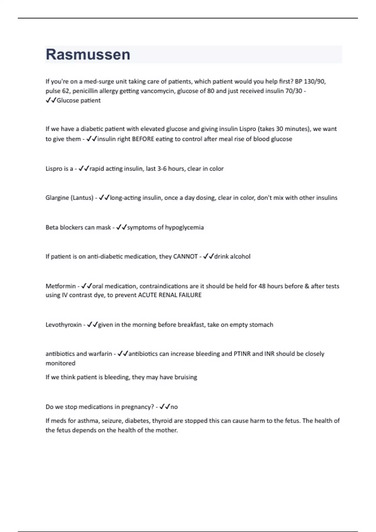 If you're on a med-surge unit taking care of patients, which patient would you help first? BP 130/90, pulse 62, penicillin allergy getting vancomycin, glucose of 80 and just received insulin 70/30 - Glucose patient If we have a diabetic patient with elevated glucose and giving insulin Lispro (takes 30 minutes), we want to give them - insulin right BEFORE eating to control after meal rise of blood glucose Lispro is a - rapid acting insulin, last 3-6 hours, clear in color Glargine (Lantus) - long-acting insulin, once a day dosing, clear in color, don't mix with other insulins Beta blockers can mask - symptoms of hypoglycemia If patient is on anti-diabetic medication, they CANNOT - drink alcohol Metformin - oral medication, contraindications are it should be held for 48 hours before & after tests using IV contrast dye, to prevent ACUTE RENAL FAILURE Levothyroxin - given in the morning before breakfast, take on empty stomach antibiotics and warfarin - antibiotics can increase bleeding and PTINR and INR should be closely monitored If we think patient is bleeding, they may have bruising Do we stop medications in pregnancy? - no If meds for asthma, seizure, diabetes, thyroid are stopped this can cause harm to the fetus. The health of the fetus depends on the health of the mother.