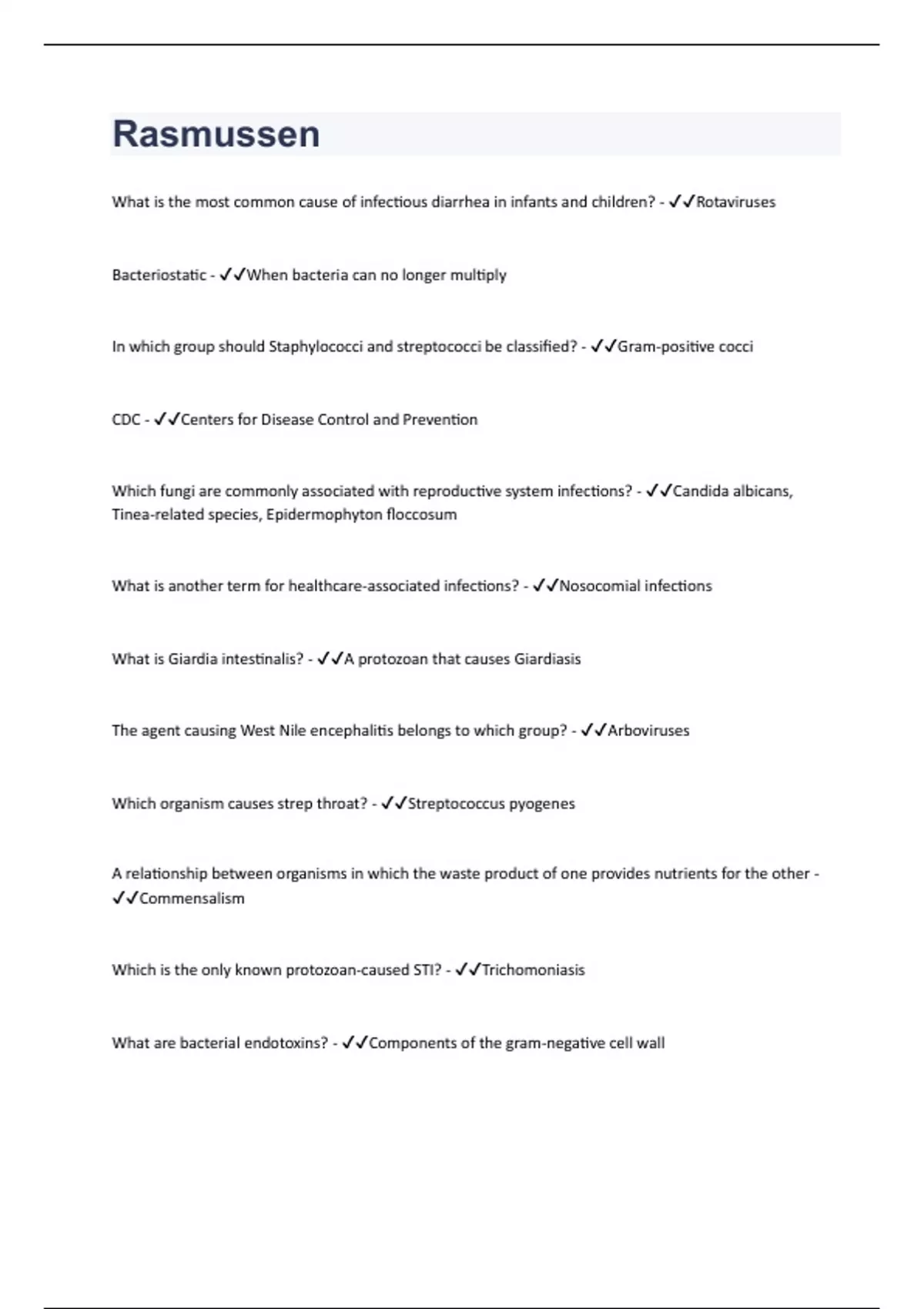 What is the most common cause of infectious diarrhea in infants and children? - Rotaviruses Bacteriostatic - When bacteria can no longer multiply In which group should Staphylococci and streptococci be classified? - Gram-positive cocci CDC - Centers for Disease Control and Prevention Which fungi are commonly associated with reproductive system infections? - Candida albicans, Tinea-related species, Epidermophyton floccosum What is another term for healthcare-associated infections? - Nosocomial infections What is Giardia intestinalis? - A protozoan that causes Giardiasis The agent causing West Nile encephalitis belongs to which group? - Arboviruses Which organism causes strep throat? - Streptococcus pyogenes A relationship between organisms in which the waste product of one provides nutrients for the other - Commensalism Which is the only known protozoan-caused STI? - Trichomoniasis What are bacterial endotoxins? - Components of the gram-negative cell wall