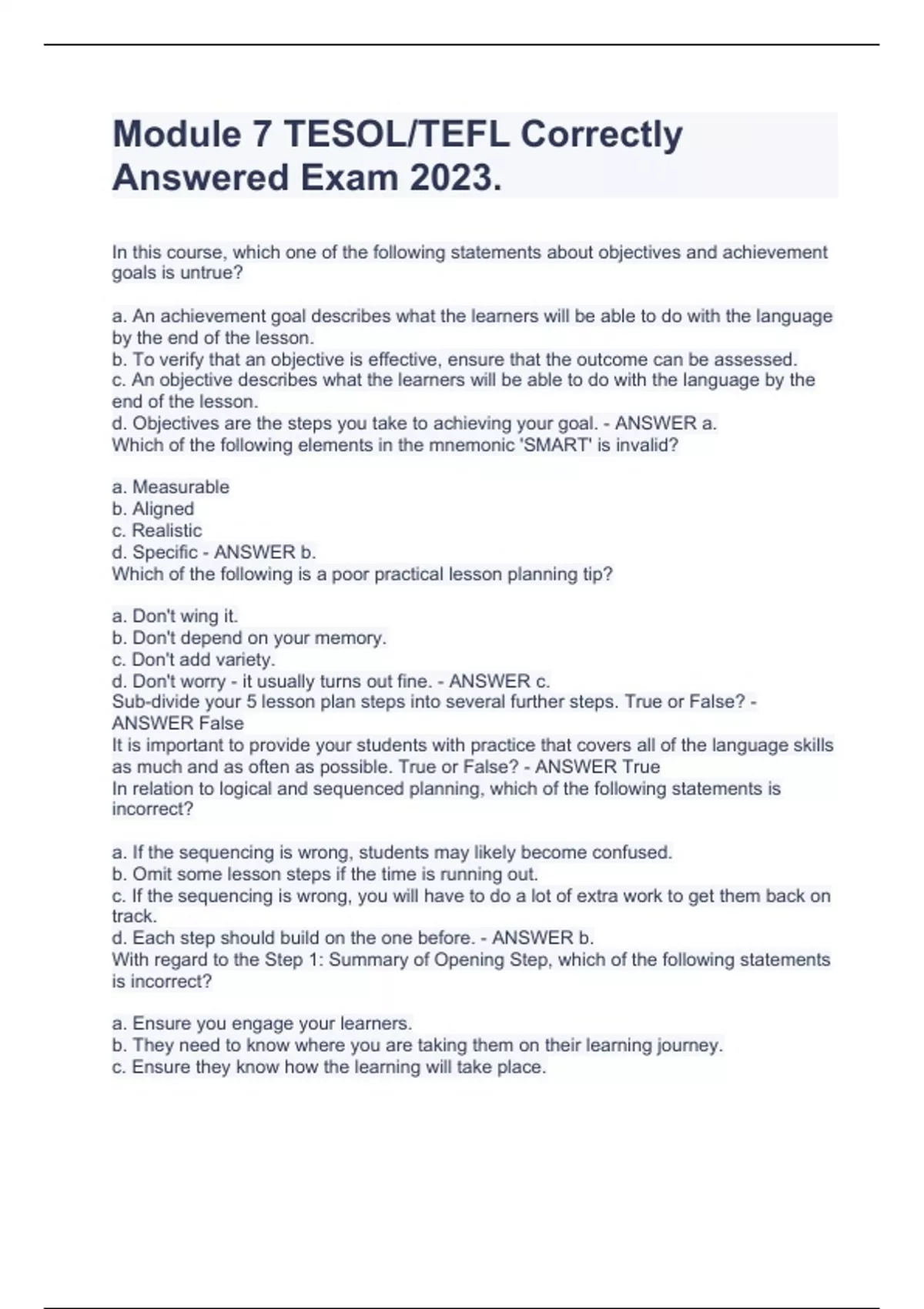 Module 7 TESOL/TEFL Correctly Answered Exam 2023.In this course, which one of the following statements about objectives and achievement goals is untrue? a. An achievement goal describes what the learners will be able to do with the language by the end of the lesson. b. To verify that an objective is effective, ensure that the outcome can be assessed. c. An objective describes what the learners will be able to do with the language by the end of the lesson. d. Objectives are the steps you take to achieving your goal. - ANSWER a. Which of the following elements in the mnemonic 'SMART' is invalid? a. Measurable b. Aligned c. Realistic d. Specific - ANSWER b. Which of the following is a poor practical lesson planning tip? a. Don't wing it. b. Don't depend on your memory. c. Don't add variety. d. Don't worry - it usually turns out fine. - ANSWER c. Sub-divide your 5 lesson plan steps into several further steps. True or False? - ANSWER False It is important to provide your students with practice that covers all of the language skills as much and as often as possible. True or False? - ANSWER True In relation to logical and sequenced planning, which of the following statements is incorrect? a. If the sequencing is wrong, students may likely become confused. b. Omit some lesson steps if the time is running out. c. If the sequencing is wrong, you will have to do a lot of extra work to get them back on track. d. Each step should build on the one before. - ANSWER b. With regard to the Step 1: Summary of Opening Step, which of the following statements is incorrect? a. Ensure you engage your learners. b. They need to know where you are taking them on their learning journey. c. Ensure they know how the learning will take place. d. Ensure you don't waste time checking their understanding at this early step. - ANSWER d. With regard to the Step 2: Summary of Introduction Of New Material Step, which of the following statements is incorrect? a. It's important that you model and demonstrate the new learning. b. You can include new points you haven't planned if time permits. c. You need to drive their involvement by getting them to participate. d. You need to ensure that the new learning is accessible to all your learners. - ANSWER b. With regard to the Step 3: Summary of Guided Practice Step, which one of the following statements is incorrect? a. Ensure they have sufficient time and opportunity to practice their new learning. b. Ensure each guided practice session involves a written worksheet. c. Ensure you have considered classroom management aspects. d. Ensure the activities are scaffolded. - ANSWER b. With regard to the Step 4: Summary of Independent Practice Step, which one of the following statements is incorrect? a. Model the required behavior. b. Assist them continually throughout their practice. c. You can try different assessment approaches. d. Ensure the activity (or activities) demonstrate mastery of the objective (or progress towards it). - ANSWER b. Which of the following is deemed to be a free/uncontrolled exercise/activity