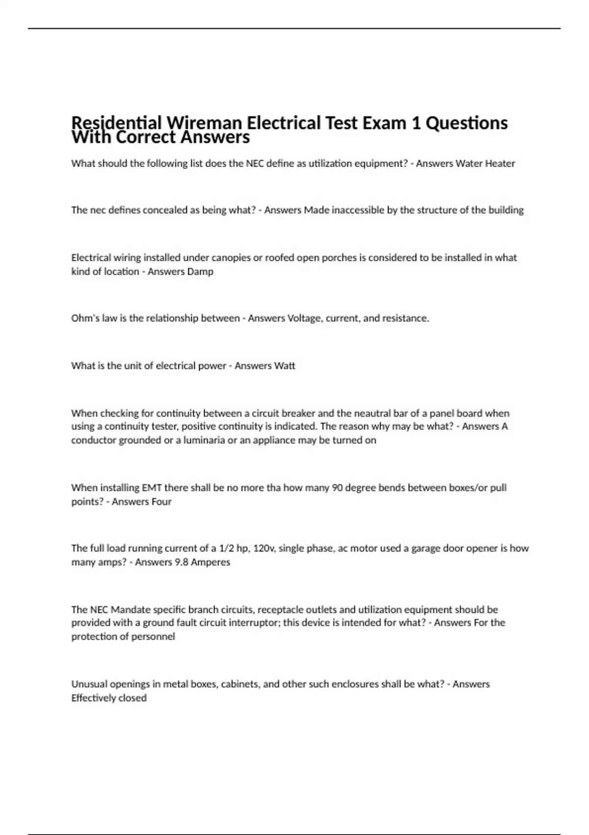 Residential Wireman Electrical Test Exam 1 Questions With Correct Answers