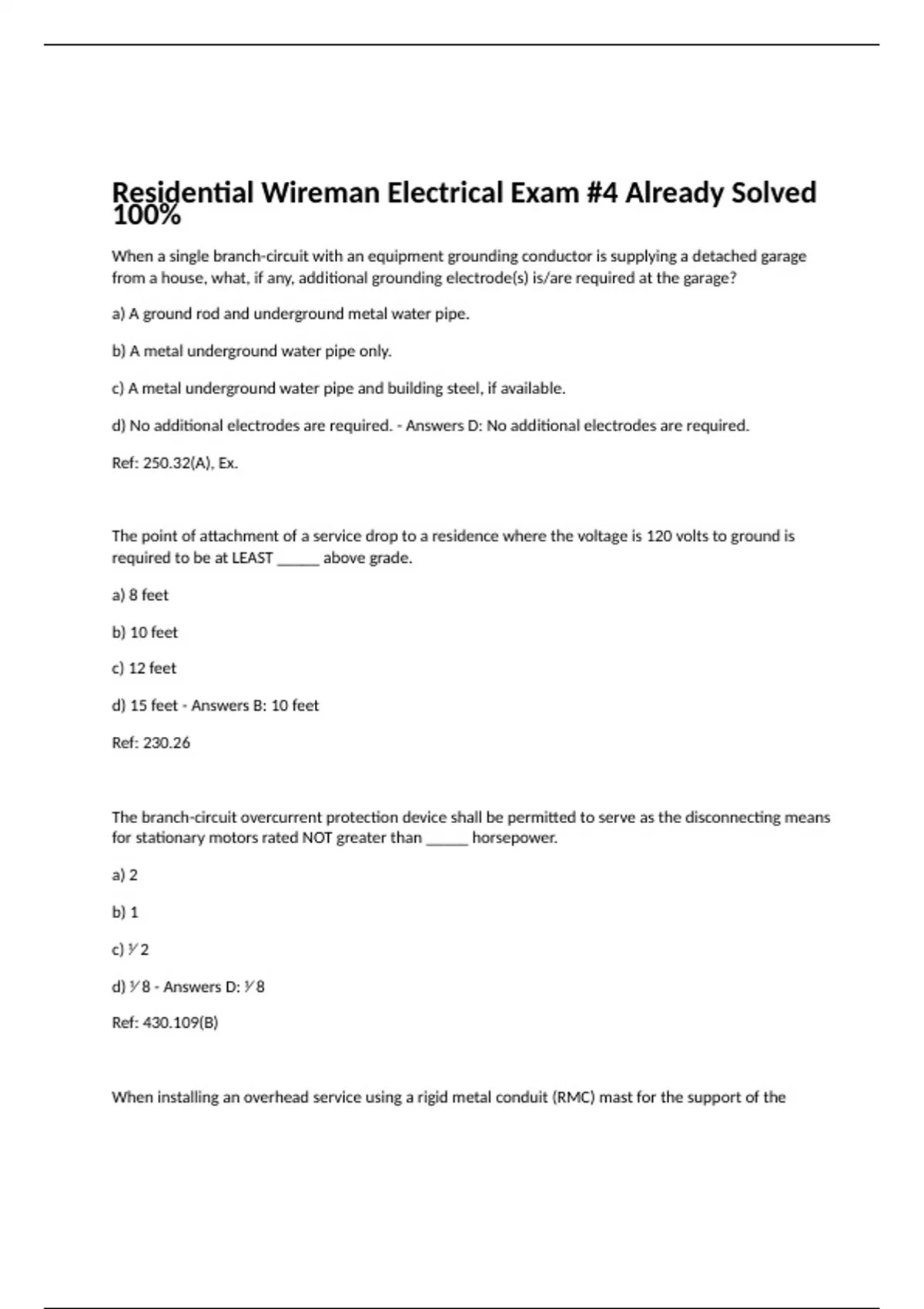When a single branch-circuit with an equipment grounding conductor is supplying a detached garage from a house, what, if any, additional grounding electrode(s) is/are required at the garage? a) A ground rod and underground metal water pipe. b) A metal underground water pipe only. c) A metal underground water pipe and building steel, if available. d) No additional electrodes are required. - Answers D: No additional electrodes are required. Ref: 250.32(A), Ex. The point of attachment of a service drop to a residence where the voltage is 120 volts to ground is required to be at LEAST _____ above grade. a) 8 feet b) 10 feet c) 12 feet d) 15 feet - Answers B: 10 feet Ref: 230.26 The branch-circuit overcurrent protection device shall be permitted to serve as the disconnecting means for stationary motors rated NOT greater than _____ horsepower. a) 2 b) 1 c) 1⁄ 2 d) 1⁄ 8 - Answers D: 1⁄ 8 Ref: 430.109(B) When installing an overhead service using a rigid metal conduit (RMC) mast for the support of the service-drop conductors, the mast shall be of adequate strength or be _____ to withstand safely the strain imposed by the service drop. a) at least 2 inches in diameter b) a minimum of 3 inches in diameter c) supported by braces or guys d) less than 4 feet in length - Answers C: supported by braces or guys Ref: 230.28 When wall switches are installed in the same room with a spa or hot tub, the MINIMUM distance from the switches to the inside wall of the hot tub or spa shall be _____. a) 5 feet b) 10 feet c) 15 feet d) 18 feet - Answers A: 5 feet Ref: 680.43(C) All 15- and 20-ampere, single-phase, 125-volt receptacle outlets located at LEAST _____ from the inside walls of a swimming pool shall be provided with GFCI protection. a) 10 feet b) 15 feet c) 20 feet d) 25 feet - Answers C: 20 feet Ref: 680.22(A)(4) A luminaire shall be supported independently of the outlet box when it weighs more than _____ pounds, unless the outlet box is listed for the weight to be supported. a) 6 b) 25 c) 35 d) 50 - Answers D: 50 Ref: 314.27(B) Of the following listed connectors, which type is prohibited for connection of a grounding conductor to enclosures? a) sheet metal screws b) pressure connectors c) clamps d) lugs - Answers A: sheet metal screws Ref: 250.8