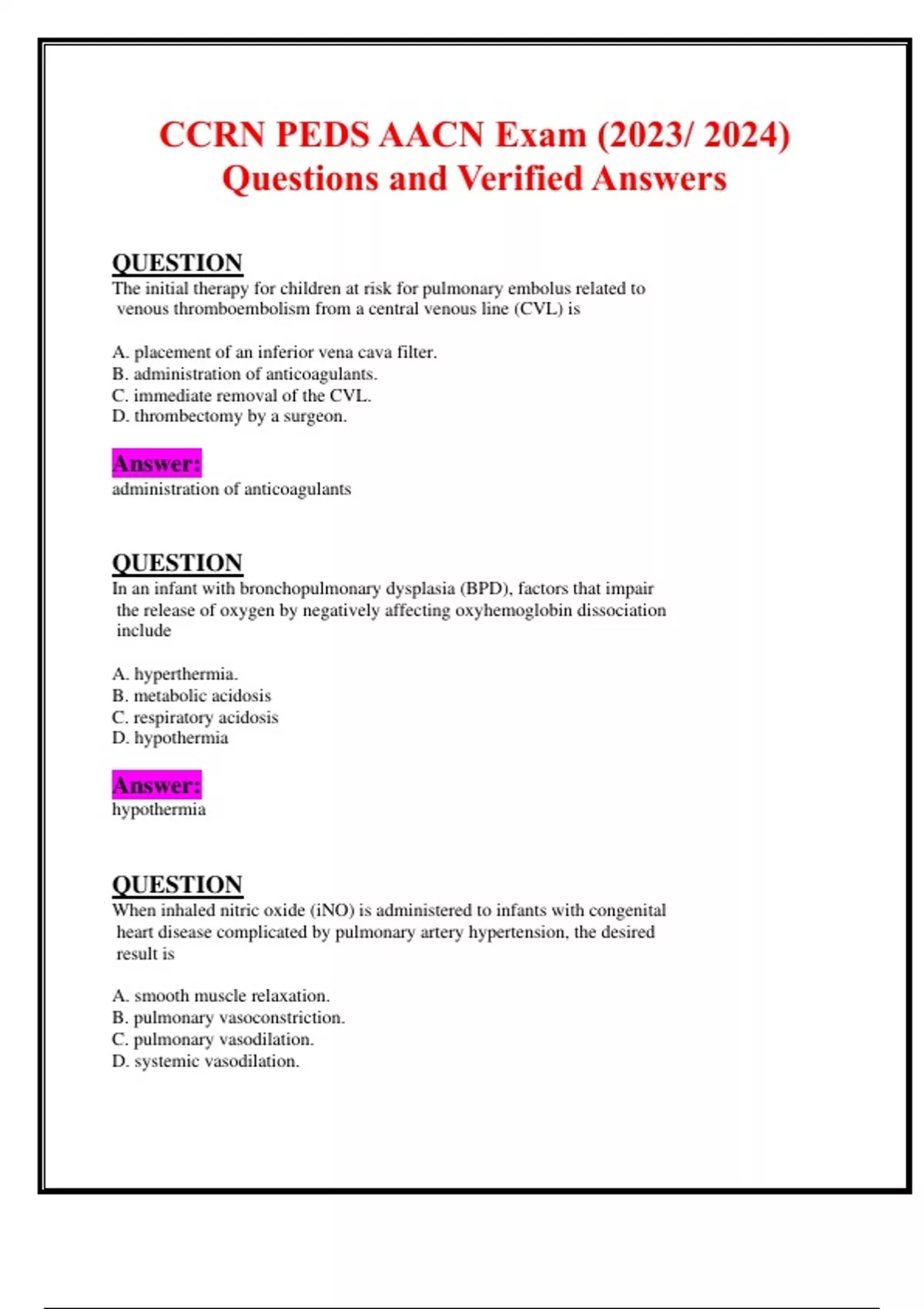 CCRN PEDS AACN Exam (2023/ 2024) Questions and Verified Answers QUESTION The initial therapy for children at risk for pulmonary embolus related to venous thromboembolism from a central venous line (CVL) is A. placement of an inferior vena cava filter. B. administration of anticoagulants. C. immediate removal of the CVL. D. thrombectomy by a surgeon. Answer: administration of anticoagulants QUESTION In an infant with bronchopulmonary dysplasia (BPD), factors that impair the release of oxygen by negatively affecting oxyhemoglobin dissociation include A. hyperthermia. B. metabolic acidosis C. respiratory acidosis D. hypothermia Answer: hypothermia QUESTION When inhaled nitric oxide (iNO) is administered to infants with congenital heart disease complicated by pulmonary artery hypertension, the desired result is A. smooth muscle relaxation. B. pulmonary vasoconstriction. C. pulmonary vasodilation. D. systemic vasodilation. Answer: pulmonary vasodilation QUESTION 19. A patient with hypovolemic shock is receiving fluid resuscitation. Dopamine (Intropin) is started at 3 mcg/kg/min for A. hypotension. B. decreased cardiac contractility. C. decreased heart rate. D. renal perfusion. Answer: renal perfusion QUESTION 20. A patient admitted following an acute asthma attack has been given multiple albuterol (Proventil) inhalation treatments. The following measurements are obtained: BP 130/78 HR 160 RR 48 FiO2 60% (by non-rebreather mask) O2 Sat 88% Physical findings could include which of the following? A. wheezing and agitation B. coughing and grunting C. pleural rub and wheezing D. stridor and bronchospasm Answer: wheezing and agitation QUESTION 21. Respiratory therapists, physical therapists, occupational therapists and nurses are all responsible for discharge teaching, with each discipline currently documenting on its own flow sheet. The best way to coordinate teaching would be to have A. daily care conferences to review and discuss patient teaching and the flow sheets. B. each discipline distribute copies of its flow sheets to each team member. C. nurses review the flow sheets of all disciplines during shift change. D. all disciplines document patient teaching on the same flow sheet. Answer: all disciplines document patient teaching on the same flow sheet QUESTION A 10-day-old infant is admitted with a suspected congenital heart defect, a history of poor feeding, and sudden onset of respiratory distress and cyanosis. Initial assessment shows: HR 180 pH 7.28 RR 72 pCO2 30 BP 48/Doppler pO2 48 CRT greater than 5 sec. HCO3 16 The patient is intubated and placed on mechanical ventilation at a rate of 20; PIP/PEEP=24/4 cm water; FiO2=100%. Subsequent ABG results show: pH 7.27 pCO2 28 pO2 50 HCO3 15 The most probable etiology of the patient's cardiopulmonary status is A. Tetralogy of Fallot. B. hypoplastic left heart syndrome. C. persistent pulmonary hypertension. D. diaphragmatic hernia. Answer: hypoplastic left heart syndrome QUESTION A teenager post cardiac arrest has a new diagnosis of hypertrophic cardiomyopathy. The parents are concerned about what to do if their son collapses again. The nurse's best response would be