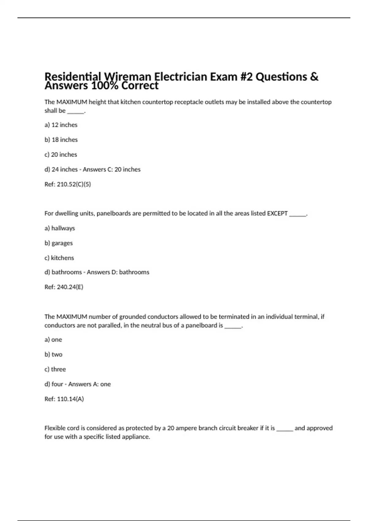 The MAXIMUM height that kitchen countertop receptacle outlets may be installed above the countertop shall be _____. a) 12 inches b) 18 inches c) 20 inches d) 24 inches - Answers C: 20 inches Ref: 210.52(C)(5) For dwelling units, panelboards are permitted to be located in all the areas listed EXCEPT _____. a) hallways b) garages c) kitchens d) bathrooms - Answers D: bathrooms Ref: 240.24(E) The MAXIMUM number of grounded conductors allowed to be terminated in an individual terminal, if conductors are not paralled, in the neutral bus of a panelboard is _____. a) one b) two c) three d) four - Answers A: one Ref: 110.14(A) Flexible cord is considered as protected by a 20 ampere branch circuit breaker if it is _____ and approved for use with a specific listed appliance. a) not less than 6 feet in length b) size 20 AWG or larger c) size 18 AWG or larger d) size 16 AWG or larger - Answers C: size 18 AWG or larger Ref: 240.5(B)(2) A 120-volt receptacle is installed on a dwelling unit kitchen island countertop that is 8 feet from the kitchen sink. Which one of the following statements, if any, is correct? a) GFCI protection is not required because the receptacle is not within 6 feet of the sink. b) GFCI protection is required for all countertop kitchen receptacles. c) GFCI protection is not required on receptacles installed on kitchen islands. d) None of the above is correct. - Answers B: GFCI protection is required for all countertop kitchen receptacles. Ref: 210.8(A)(6) Where a mobile home has the main service disconnecting means installed outdoors, the disconnecting means shall be installed, so the bottom of the enclosure is NOT less than _____ above finished grade. a) 1 foot b) 2 feet c) 3 feet d) 4 feet - Answers B: 2 feet Ref: 550.32(F) A GFCI protected receptacle outlet that provides power to a permanently installed swimming pool recirculating pump motor, shall be permitted not closer than _____ feet from the inside wall of the pool. a) 6 b) 5 c) 12 d) 15 - Answers A: 6 Ref: 680.22(A)(1)