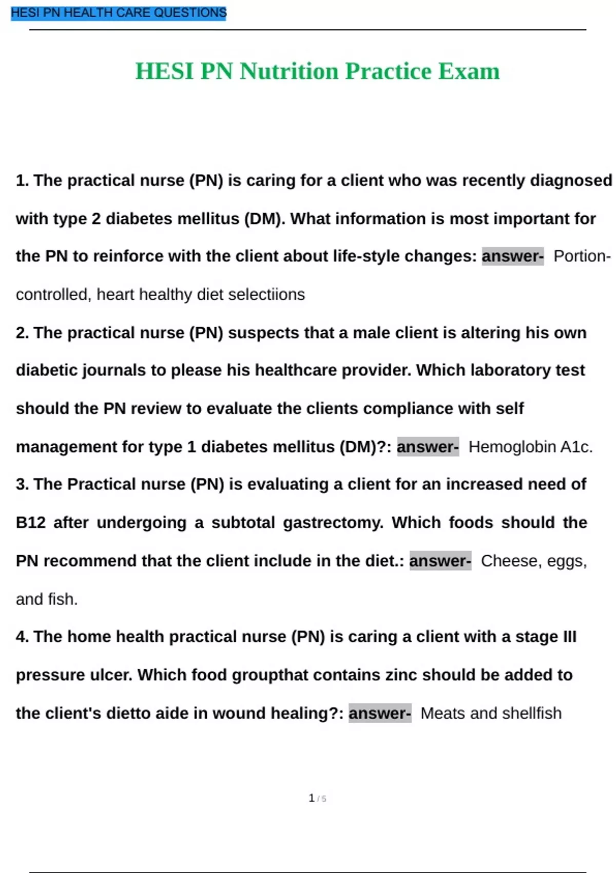 The practical nurse (PN) is caring for a client who was recently diagnosed with type 2 diabetes mellitus (DM). What information is most important for the PN to reinforce with the client about life-style changes: answer- Portioncontrolled, heart healthy diet selectiions 2. The practical nurse (PN) suspects that a male client is altering his own diabetic journals to please his healthcare provider. Which laboratory test should the PN review to evaluate the clients compliance with self management for type 1 diabetes mellitus (DM)?: answer- Hemoglobin A1c. 3. The Practical nurse (PN) is evaluating a client for an increased need of B12 after undergoing a subtotal gastrectomy. Which foods should the PN recommend that the client include in the diet.: answer- Cheese, eggs, and fish. 4. The home health practical nurse (PN) is caring a client with a stage III pressure ulcer. Which food groupthat contains zinc should be added to the client's dietto aide in wound healing?: answer- Meats and shellfish 1 / 5 5. The practical nurse (PN) receives four new admissions in an assisted living community. After reviewing the clients' medical histories, which client should the PN evaluate for a higher caloric diet?: A client with bacterial pneumonia. 6. The practical nurse (PN) is assisting and Orthodox Jewish client who has dementia make weekly dinner choices in an assisted living community. Which main course selections should the PN suggest that are suitable for a kosher diet?: Lamb chops with mint jelly. 7. The practical nurse (PN) is evaluating the client's knowledge of lowsodium menu selections. Which food items listed by the client confirm appropriate choices? (select all that apply.): A. White rice with steamed vegetables. B. Cottage cheese with sliced tomatoes. 8. A client who is lactose intolerant asks the practical nurse (PN) for suggestions about different food sources that are enriched in calcium and vitamin D. Which foods should the PN suggest?: Fortified soy products. 9. The practical nurse (PN) is reviewing guidelines to manage stress inconti- nence with a female client. Which dietary change should the PN emphasize that will benefit the client?: Avoid alcohol and caffeine. 2 / 5 10. The practical nurse (PN) is reviewing the dietary recommendations with the client who had a partial gastrectomy and experienced dumping syndrome. Which statement by the client indicates that the recommendations were un- derstood?: Fluids should be limited to eight ounces with meals.