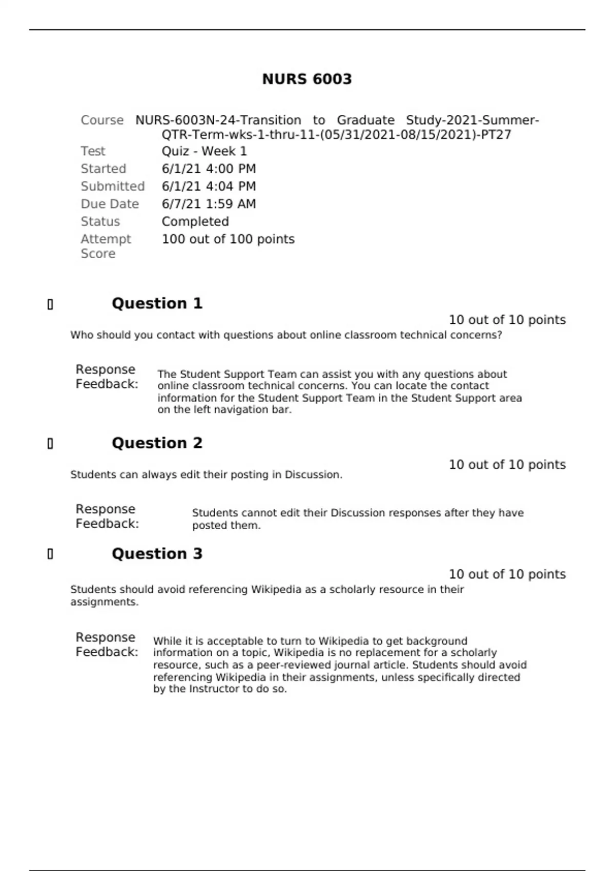 NURS 6003 Week 1 Quiz Walden's Student Readiness Orientation (100 out of 100 points - June QTR) Walden