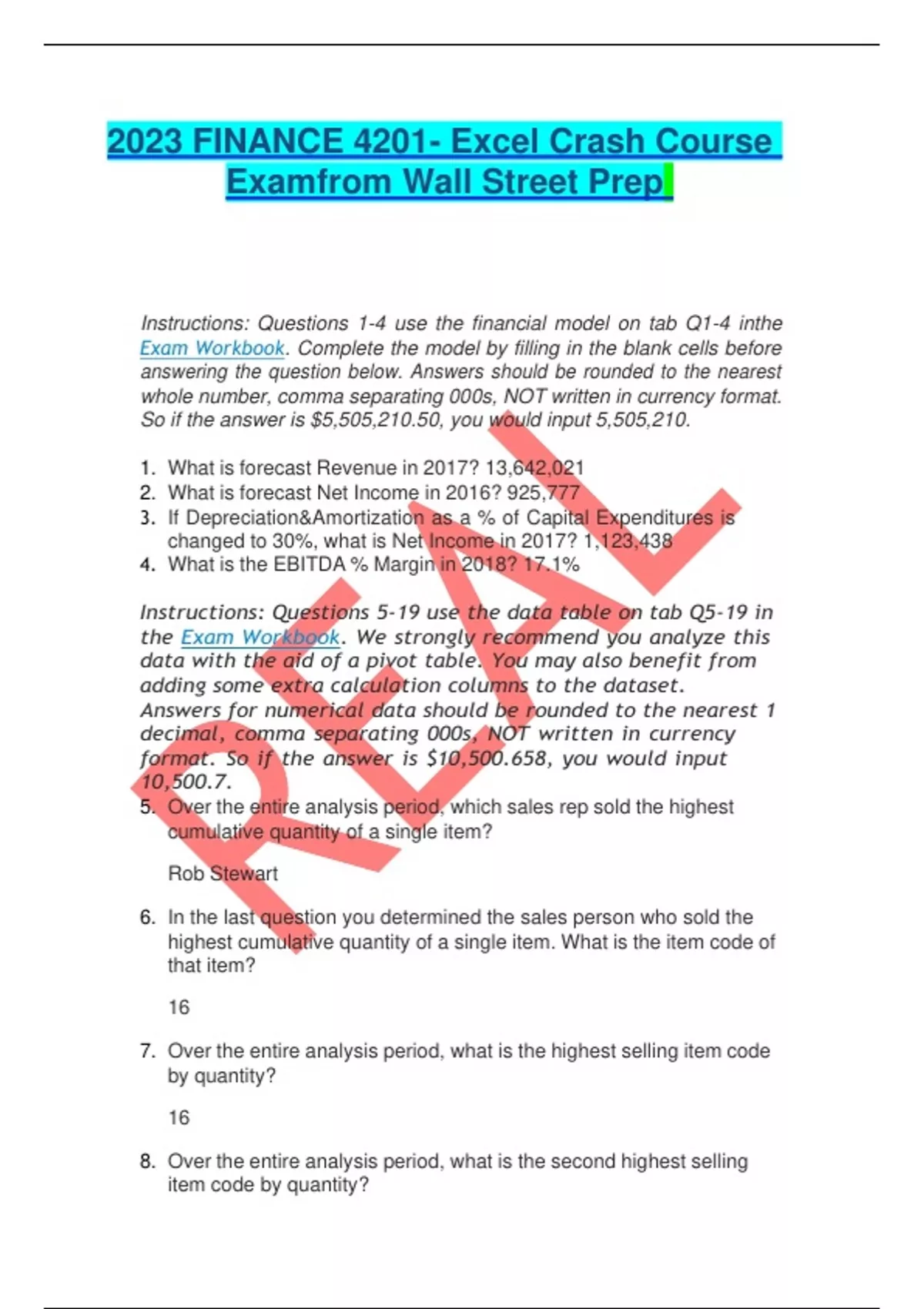2023 FINANCE 4201- Excel Crash Course Examfrom Wall Street Prep