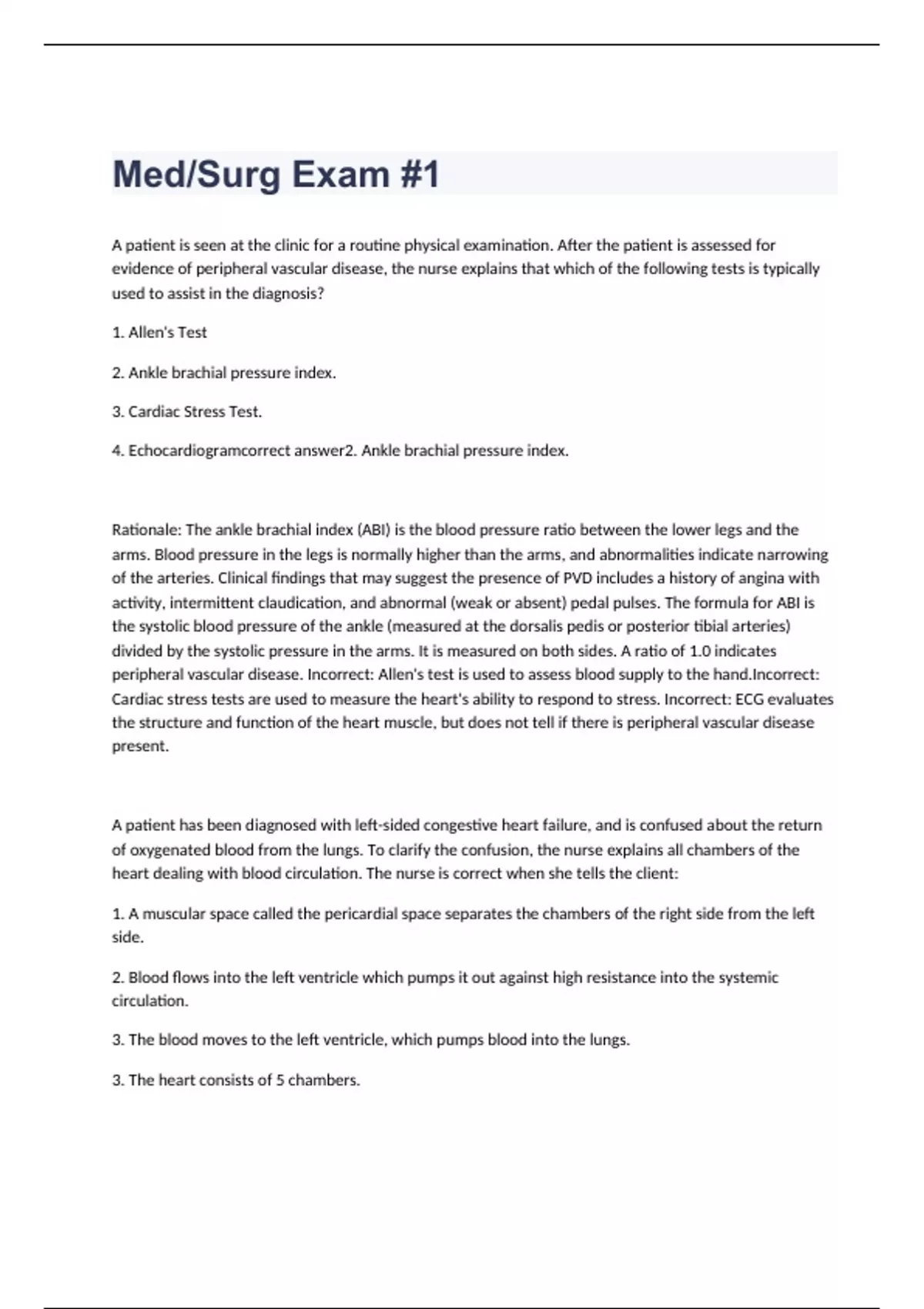 A patient is seen at the clinic for a routine physical examination. After the patient is assessed for evidence of peripheral vascular disease, the nurse explains that which of the following tests is typically used to assist in the diagnosis? 1. Allen's Test 2. Ankle brachial pressure index. 3. Cardiac Stress Test. 4. Echocardiogram 2. Ankle brachial pressure index. Rationale: The ankle brachial index (ABI) is the blood pressure ratio between the lower legs and the arms. Blood pressure in the legs is normally higher than the arms, and abnormalities indicate narrowing of the arteries. Clinical findings that may suggest the presence of PVD includes a history of angina with activity, intermittent claudication, and abnormal (weak or absent) pedal pulses. The formula for ABI is the systolic blood pressure of the ankle (measured at the dorsalis pedis or posterior tibial arteries) divided by the systolic pressure in the arms. It is measured on both sides. A ratio of 1.0 indicates peripheral vascular disease. Incorrect: Allen's test is used to assess blood supply to the hand.Incorrect: Cardiac stress tests are used to measure the heart's ability to respond to stress. Incorrect: ECG evaluates the structure and function of the heart muscle, but does not tell if there is peripheral vascular disease present. A patient has been diagnosed with left-sided congestive heart failure, and is confused about the return of oxygenated blood from the lungs. To clarify the confusion, the nurse explains all chambers of the heart dealing with blood circulation. The nurse is correct when she tells the client: 1. A muscular space called the pericardial space separates the chambers of the right side from the left side. 2. Blood flows into the left ventricle which pumps it out against high resistance into the systemic circulation. 3. The blood moves to the left ventricle, which pumps blood into the lungs. 3. The heart consists of 5 chambers. 4. The left atrium receives oxygenated blood from the lungs. 5. The right atrium receives deoxygenated blood from the body tissues. 2. Blood flows into the left ventricle which pumps it out against high resistance into the systemic circulation. 3. The blood moves to the left ventricle, which pumps blood into the lungs. 4. The left atrium receives oxygenated blood from the lungs. 5. The right atrium receives deoxygenated blood from the body tissues. Rationale: Heart consists of 4 chambers: 2 atria and 2 ventricles. The right and left chambers are separated down the middle of the heart by a septum, like a wall. The right atrium receives deoxygenated from the body, and the blood then moves down into the right ventricle, which pumps it to the lungs with low resistance. The left atrium then receives oxygenated blood from the lungs, and that blood moves down into the left ventricle. The left ventricle, which is the most muscular chamber, pumps oxygen rich blood into the systemic circulation. A patient recovering from a MI has been in bed for 6 days. The patient now complains of calf pain. The nurse should first: 1. Administer pain medication as ordered. 2. Assess the calf for redness warmth and swelling. 3. Massage the calf to relieve the muscle cramp. Observe the patient walking. 2. Assess the calf for redness warmth and swelling. Rationale: Due to the time spend in bed and inactive, the patient is at high risk for the development of a DVT. Pain in the calf, redness or heat, and swelling in the affected extremity are signs of a DVT. Diagnostic tests that help diagnose a DVT include a D-dimer test to confirm the presence of fibrin degradation in products from a clot, venous ultrasound, venography to visualize the clot with contrast, or less commonly MRI or CT. The nurse is caring for a patient in the early stages of heart failure. The family is curious as to how the body adapts to heart failure. The nurse knows that during the early stages of heart failure, which specific compensatory mechanisms occur? 1. Decreased cardiac output inhibits the release of ADH by the pituitary gland. 2. Hypotension stimulates the baroreceptors to increase sympathetic activity. 3. Hypotension stimulates the baroreceptors to decrease sympathetic activity. 4. Impaired renal perfusion inhibits aldosterone release. 2. Hypotension stimulates the baroreceptors to increase sympathetic activity. Rationale: As arterial blood pressure falls, the baroreceptors of the carotid and aorta are stimulated. This causes a sympathetic release of catecholamines, resulting in vasoconstriction and an increased heart rate to compensate. The compensatory mechanism increases peripheral vascular resistance and also the work load of the heart. This can worsen heart failure if not treated. Incorrect: Decreased cardiac output will INCREASE ADH release, leading to fluid retention. Incorrect: Impaired renal perfusion will stimulate aldosterone release leading to addition fluid and sodium retention. The nurse is assessing a patient with atrial fibrillation and a rapid ventricular rate. The nurse would expect to see: 1. Distended juglar veins. 2. Dizziness and hypotension. 3. Hypertension and headache. 4. Lower extremity pain. 2. Dizziness and hypotension. Rationale: Atrial fibrillation is any arrhythmia in which the atria initiate rapid, ineffective contractions that are not synchronized with ventricular contractions. This patient has uncontrolled atrial fibrillation, which can result in a low cardiac output. Signs and symptoms of a low cardiac output include hypotension, dizziness, weakness, fatigue, shortness of breath, and syncope. The nurse is caring for a patient scheduled to undergo a mitral valve replacement. The nurse should monitor for which complication of mitral stenosis? 1. Left-sided heart failure. 2. MI 3. Pulmonary Hypertension 4. Respiratory Alkalosis 3. Pulmonary Hypertension Rationale: Mitral stenosis impeded blood flow from the left atrium to the left ventricle of the heart. This creates increased pulmonary vascular resis