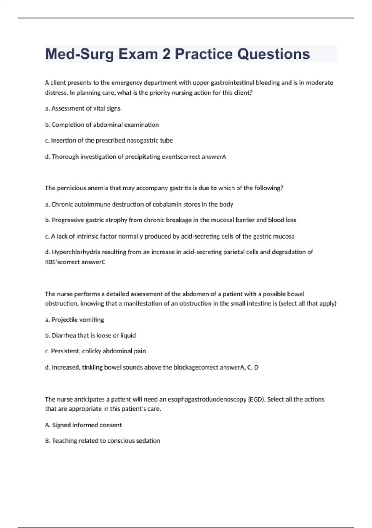 A client presents to the emergency department with upper gastrointestinal bleeding and is in moderate distress. In planning care, what is the priority nursing action for this client? a. Assessment of vital signs b. Completion of abdominal examination c. Insertion of the prescribed nasogastric tube d. Thorough investigation of precipitating events A The pernicious anemia that may accompany gastritis is due to which of the following? a. Chronic autoimmune destruction of cobalamin stores in the body b. Progressive gastric atrophy from chronic breakage in the mucosal barrier and blood loss c. A lack of intrinsic factor normally produced by acid-secreting cells of the gastric mucosa d. Hyperchlorhydria resulting from an increase in acid-secreting parietal cells and degradation of RBS's C The nurse performs a detailed assessment of the abdomen of a patient with a possible bowel obstruction, knowing that a manifestation of an obstruction in the small intestine is (select all that apply) a. Projectile vomiting b. Diarrhea that is loose or liquid c. Persistent, colicky abdominal pain d. Increased, tinkling bowel sounds above the blockage A, C, D The nurse anticipates a patient will need an esophagastroduodenoscopy (EGD). Select all the actions that are appropriate in this patient's care. A. Signed informed consent B. Teaching related to conscious sedation C. Full set of vital signs prior to procedure D. Clear liquids until procedure E. Keep the patient NPO until gag reflex returns post-procedure A, B, C, E A patient with chronic gastritis associated with the presence of H. pylori is treated with triple-drug therapy. The nurse explains to the patient that the drugs commonly included in this regimen include a. Famotidine (Pepcid), magnesium hydroxide (Mylanta), and pantoprazole (Protonix). b. Amoxicillin (Amoxil), clarithromycin (Biaxin), and omeprazole (Prilosec). c. Sucralfate (Carafate), nystatin (Mycostatin), and bismuth subsalicylate (Pepto-Bismol). d. Metoclopramide (Reglan), bethanechol (Urecholine), and promethazine (Phenergan). B The nurse is caring for a client with acute pancreatitis and is monitoring the client for paralytic ileus. Which assessment data should alert the nurse to this occurrence? a. Inability to pass flatus b. Loss of anal sphincter control c. Severe, constant pain with rapid onset d. Firm, nontender mass palpable at the lower right costal margin A In caring for a client with cholelithiasis and a possible biliary obstruction what clinical findings would you expect? Select all that apply a. Clay colored or light colored bowel movements b. Abdominal pain c. Dilute yellow urine d. Jaundice e. Normal appetite A, B, D The nurse is assessing a client who is experiencing an acute episode of cholecystitis. Where should the nurse anticipate the location of the pain? a. Right lower quadrant, radiating to the back b. Right lower quadrant, radiating to the umbilicus c. Right lower quadrant, radiating to the left scapula and shoulder d. Right upper quadrant, radiating to the right scapula and shoulder D Which of the following would be the most important for a nurse to teach a client who is hospitalized with acute pancreatitis prior to discharge? a. The importance of monitoring amylase and lipase levels b. Avoidance of alcohol use for up to a year c. Use of aspirin instead of acetaminophen as an OTC medication d. How to care for a T-tube B You are a nurse caring for a client that has just returned from a cholecystectomy. All of the following interventions are appropriate for this patient except a. Encourage early ambulation b. Deep breathe and cough every hour c. Regular diet d. Splint abdomen when moving and coughing C The nurse knows that an important role of the pancreas that may be diminished during pancreatitis is a. release of secretin b. release of bicarbonate to decrease acidity of gastric chyme. c. decrease in cholesterol metabolism. d. release of gastrin by duodenal mucosa B The nurse is taking the patient's blood pressure, while inflating the cuff the nurse notices jerking motions of the patient's arm and hand. The nurse suspects the patient has a. Hypokalemia b. Hypocalcemia c. Hypernatremia d. Hypercalcemia B With acute pancreatitis, what lab value rises within 12 hours and stays elevated for 4 days? a. Serum amylase b. Serum lipase. c. Serum potassium d. Serum triglyceride A A patient admitted with a GI bleed has an initial hemoglobin of 12.5g/dL and hematocrit of 40%. Four hours later the patient has a hemoglobin of 9.8d/dL and hematocrit of 24%. The patient has stable vital signs, is receiving lactated ringers at 150ml/hr and has had drainage but no sign of blood from the nasogastric tube. You interpret these findings as a. The nasogastric tube needs to be replaced. b. The patient needs to go to surgery ASAP. c. This decrease is hemoglobin and hematocrit was caused by hemodilution from fluid replacement therapy. The lab needs to be called to re-draw the hemoglobin and hematocrit C